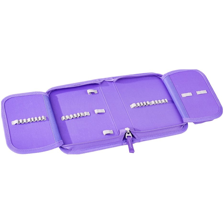 Školní penál se dvěmi klopami, prázdný. Obsahuje 25 gumových poutek pro úschovu psacích potřeb a 5 širších gumových poutek pro další školní potřeby (guma, ořezávátko, pravítko). Na rubu klopy průhledná folie pro založení rozvrhu hodin.