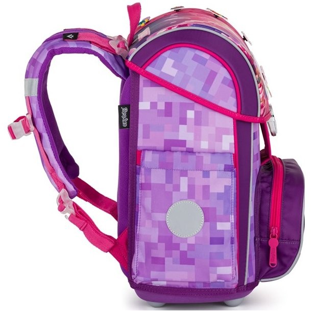 Dívčí školní aktovka Playworld Girl z řady Premium je anatomicky tvarovaná a zajišťuje správné usazení na zádech. Vyztužená záda a vnitřní výztuha udržují tvar batohu. Polstrování je z příjemného prodyšného materiálu, široké měkčené popruhy jsou navrženy tak, aby dobře přilnuly a rovnoměrně zatížily ramena dítěte. Aktovka se skládá z jedné prostorné komory, kam se pohodlně vejdou všechny školní pomůcky pro děti v 1. a ve 2. třídě. Dno školní tašky je z pevného materiálu, chrání tím obsah před převržením a vysypáním. Zapínání je na bezpečnostní kovovou přezku s reflexní odrazkou. Přední kapsička je určena na svačinu, nechybí řada reflexních prvků, díky kterým je aktovka viditelnější.