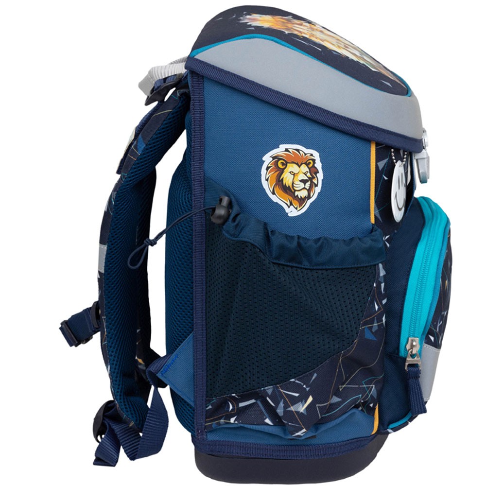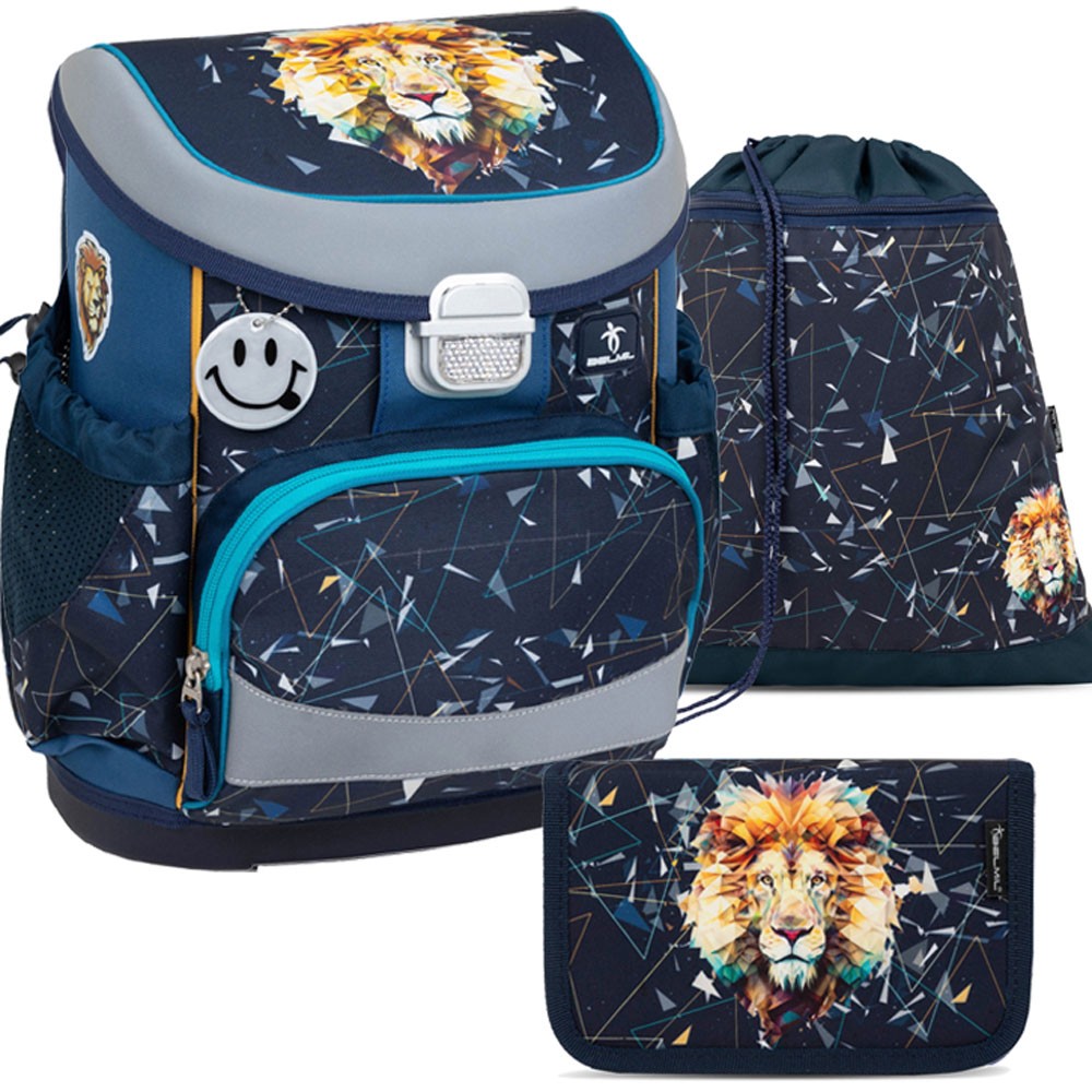 Lehká chlapecká školní aktovka pro prvňáčkys motivem krásného lva určena pro drobné děti od 1. do 3. třídy ZŠ. Set se skládá z aktovky, penálu a vaku na záda stejného motivu. Praktickým doplňkěm je i reflexní přívěšek ve tvaru smajlíka.