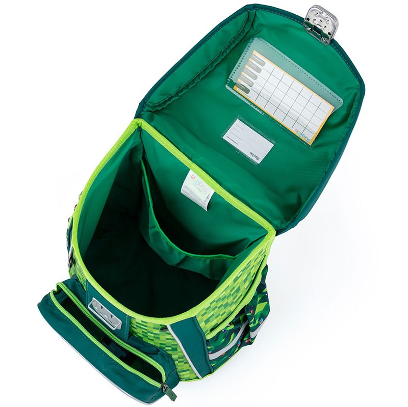 Jedna velká, přehledná komora má uvnitř dvojitou pohyblivou přepážku (na desky) s gumou. Samostatná venkovní kapsa na svačinový box je z přední strany termoizolovaná. Dvě stejné boční kapsy jsou nově ze síťoviny na gumu pro jednodušší umístění lahve či deštníku.