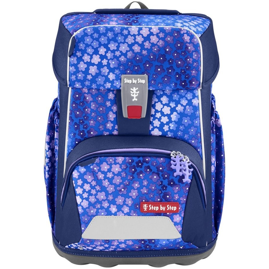 Penál: Step by Step vybavený penál obsahuje 7 silných trojhranných pastelek s nelámavými tuhami, 12 tenkých trojhranných pastelek, tužku, pravítko rovné, pravítko trojúhelníkové, guma, dvojité ořezávátko, rozvrh hodin. Penál se zapínání na zip.
