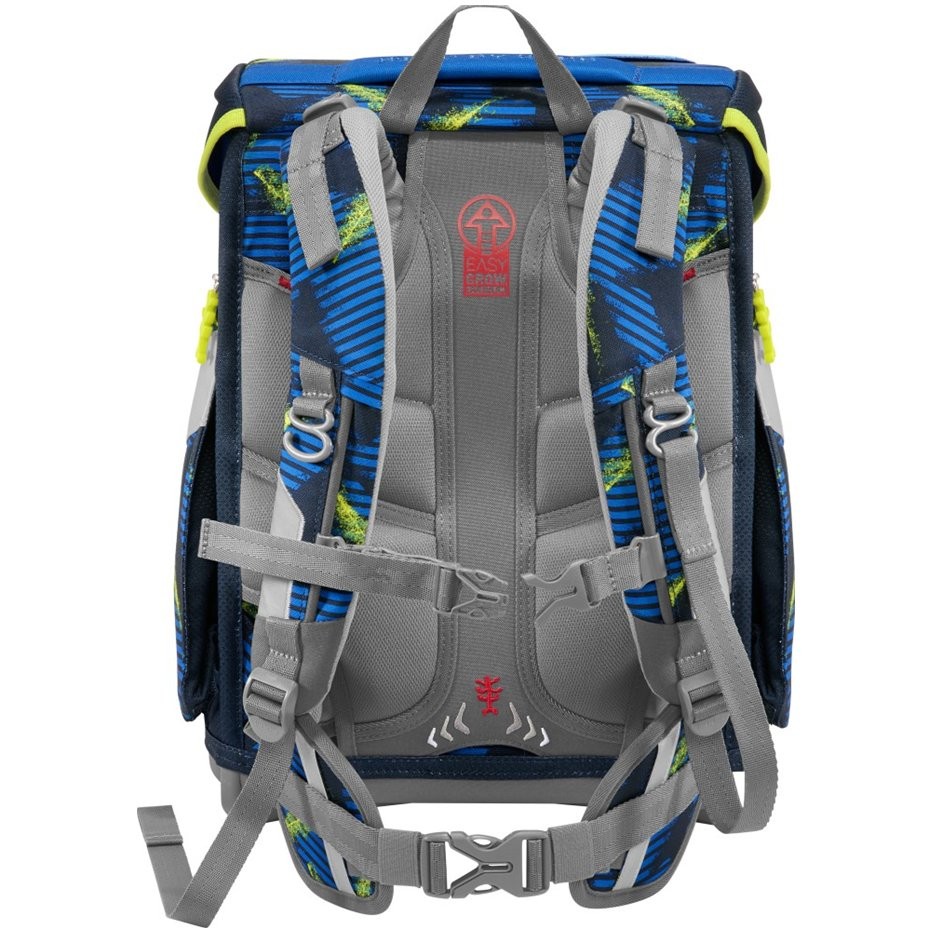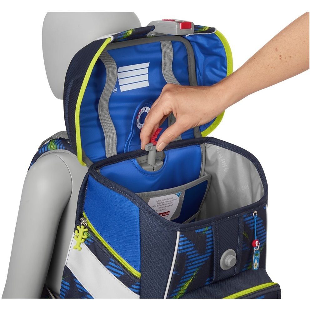 - možnost plynulého výškového nastavení ramenních popruhů pomocí otočného mechanismu uvnitř aktovky, zajišťuje přesné nastavení ramenních popruhů přímo na zádech dítěte