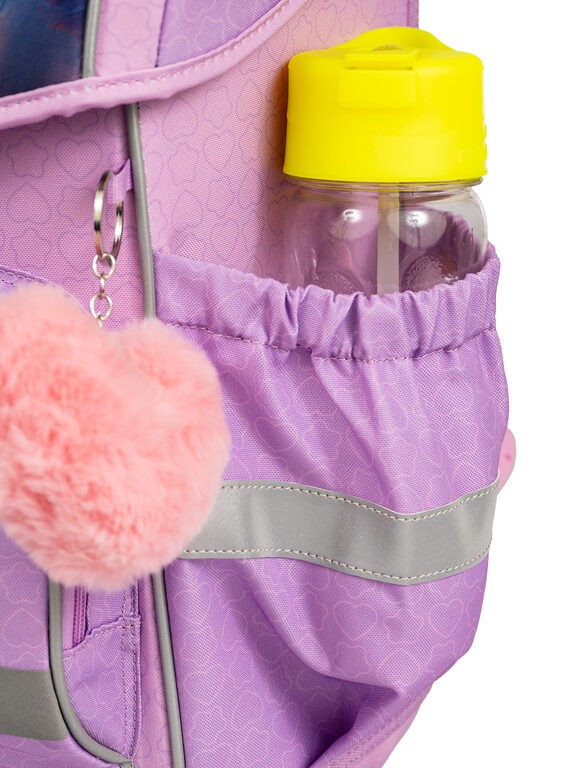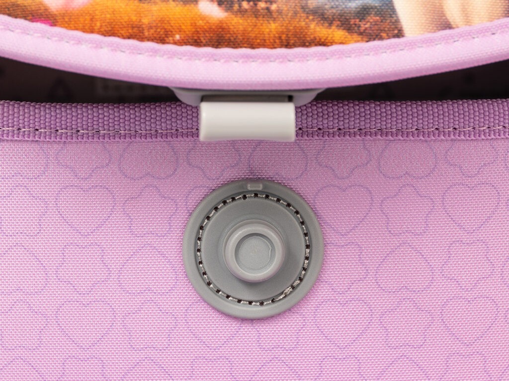 VNITŘNÍ USPOŘÁDÁNÍ – prostorná hlavní vnitřní komora je rozdělená látkovou přepážkou pro uložení boxu na sešity či knih. Součástí hlavní komory je také kapsička pro uložení drobností, odepínatelný kroužek na klíč a štítek na jméno a adresu. Ve víku je průhledná kapsička na rozvrh hodin Kapsa na svačinový box je částečně termoizolační, aby si jídlo déle udrželo svoji teplotu. Po obou stranách batohu se nalézají kapsy na deštník nebo lahev s pitím. Kapsy svým umístěním a elastickými okraji pomáhají eliminovat riziko rozlití nápoje a poničení obsahu aktovky.