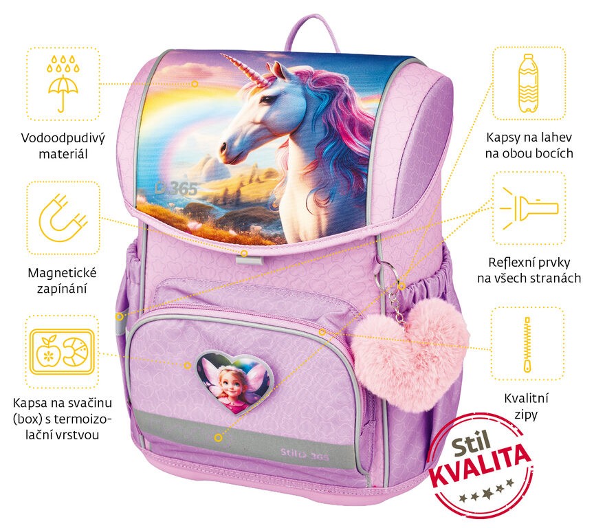 Školní aktovka pro prvňáčky (vhodná pro 1. – 3. třídu). Kvalitní, ergonomicky tvarovaná odlehčená aktovka je vybavena reflexními prvky a anatomicky tvarovanými zády s pevnou konstrukcí. Školní aktovky Stil jsou certifikovány a ověřeny lékaři.