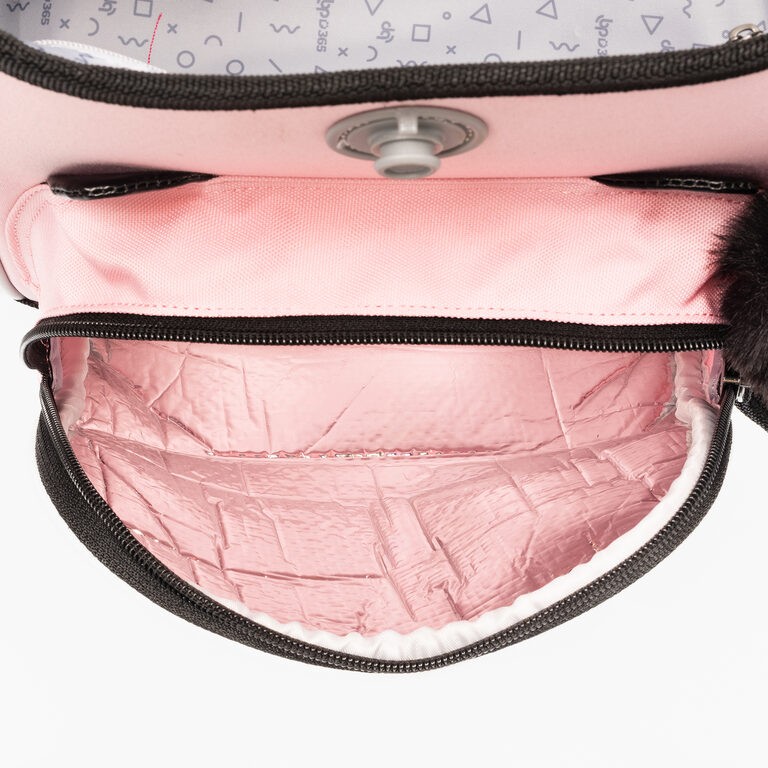 Vnitřní uspořání – prostorná hlavní vnitřní komora je rozdělená látkovou přepážkou pro uložení boxu na sešity či knih. Součástí hlavní komory je také kapsička pro uložení drobností, odepínatelný kroužek na klíč a štítek na jméno a adresu. Ve víku je průhledná kapsička na rozvrh hodin Kapsa na svačinový box je částečně termoizolační, aby si jídlo déle udrželo svoji teplotu. Po obou stranách batohu se nalézají kapsy na deštník nebo lahev s pitím. Kapsy svým umístěním a elastickými okraji pomáhají eliminovat riziko rozlití nápoje a poničení obsahu aktovky.