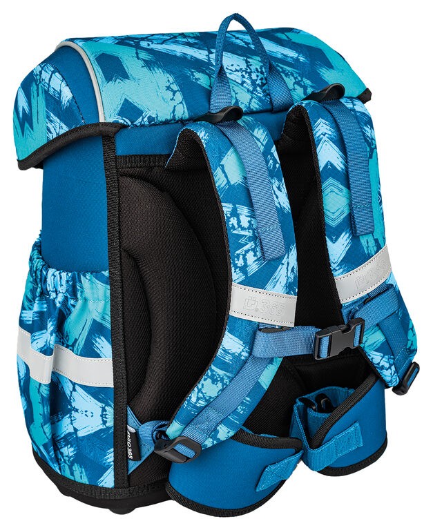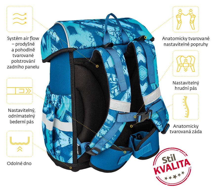 Výškově nastavitelný hrudní a nově i odnímatelný bederní pás s kvalitní přezkou zajistí pohodlné usazení aktovky na zádech dítěte i správné rozložení váhy