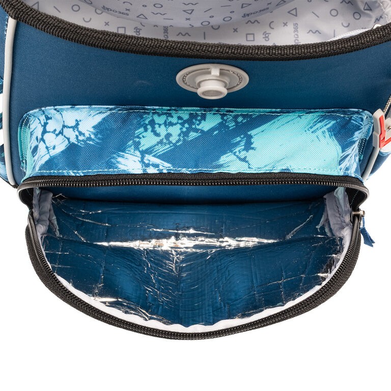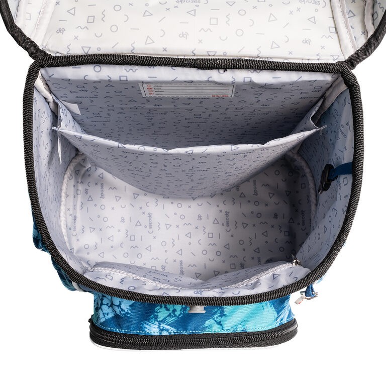Vnitřní uspořání – prostorná hlavní vnitřní komora je rozdělená látkovou přepážkou pro uložení boxu na sešity či knih. Součástí hlavní komory je také kapsička pro uložení drobností, odepínatelný kroužek na klíč a štítek na jméno a adresu. Ve víku je průhledná kapsička na rozvrh hodin Kapsa na svačinový box je částečně termoizolační, aby si jídlo déle udrželo svoji teplotu. Po obou stranách batohu se nalézají kapsy na deštník nebo lahev s pitím. Kapsy svým umístěním a elastickými okraji pomáhají eliminovat riziko rozlití nápoje a poničení obsahu aktovky.