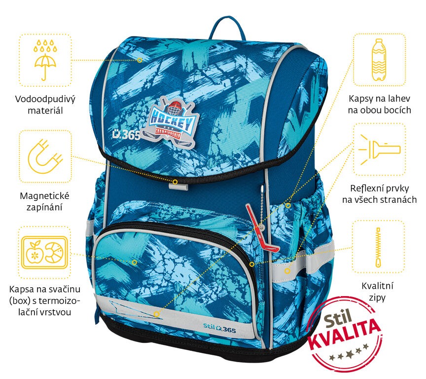 Aktovka do první třídy (vhodná pro 1. – 3. třídu). Kvalitní, ergonomicky tvarovaná odlehčená aktovka je vybavena reflexními prvky a anatomicky tvarovanými zády s pevnou konstrukcí. Školní aktovky Stil jsou certifikovány a ověřeny lékaři.