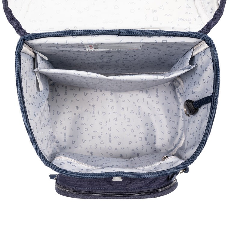 Vnitřní uspořání – prostorná hlavní vnitřní komora je rozdělená látkovou přepážkou pro uložení boxu na sešity či knih. Součástí hlavní komory je také kapsička pro uložení drobností, odepínatelný kroužek na klíč a štítek na jméno a adresu. Ve víku je průhledná kapsička na rozvrh hodin Kapsa na svačinový box je částečně termoizolační, aby si jídlo déle udrželo svoji teplotu. Po obou stranách batohu se nalézají kapsy na deštník nebo lahev s pitím. Kapsy svým umístěním a elastickými okraji pomáhají eliminovat riziko rozlití nápoje a poničení obsahu aktovky.