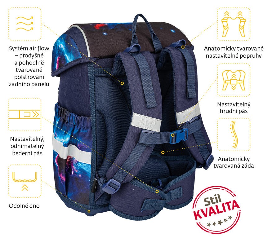 Aktovka do školy (vhodná pro 1. – 3. třídu). Kvalitní, ergonomicky tvarovaná odlehčená aktovka je vybavena reflexními prvky a anatomicky tvarovanými zády s pevnou konstrukcí. Školní aktovky Stil jsou certifikovány a ověřeny lékaři.