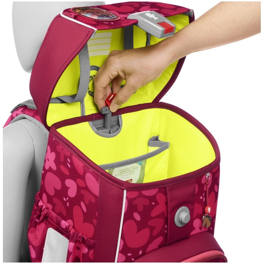 Stylová aktovka do školy má hmotnost 1 050 g a je vhodná pro větší děti od 120 do 170 cm výšky. Aktovka disponuje EASY GROW SYSTEMEM, který roste s dítětem (aktovka je vhodná pro děti od 1. do 4. třídy). Má ultralehký zádový panel ze skelných vláken, ergonomicky tvarovaná záda s prodyšným polstrováním a nastavitelné a ergonomické ramenní popruhy. V případě potřeby můžete aktovku upravit za pomocí dotahovacích pásků pro těsné doléhání aktovky k zádům. Školní taška má pro zdravý zad vašich dětu odnímatelný, výškově nastavitelný hrudní popruh s úchyty na konce ramenních popruhů a polstrovaný, odnímatelný bederní pás.