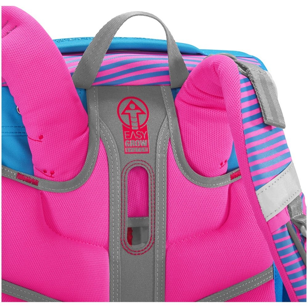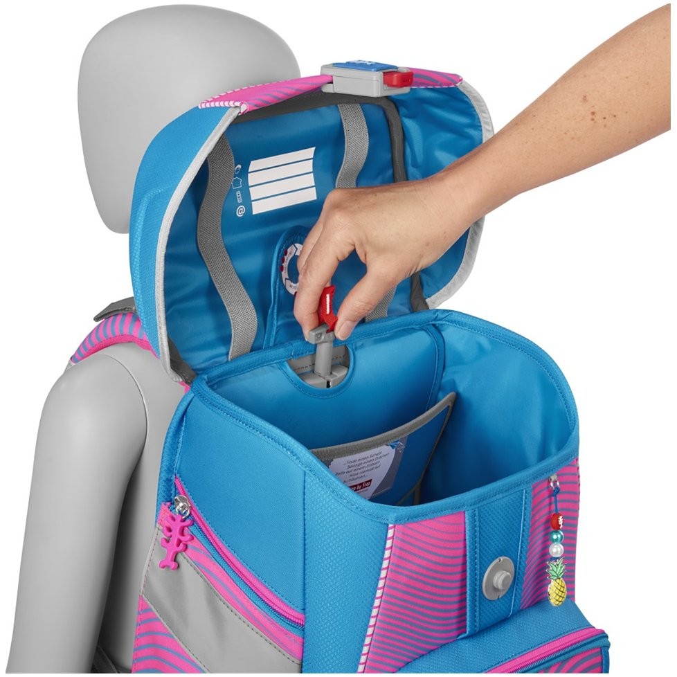 Prostorná školní taška pro prvňáčka má hmotnost 1 250 g a je vhodná pro děti od 100 do 150 cm výšky. Aktovka pro prvňáčky má vyměnitelné obrázky MAGIC MAGS, EASY GROW SYSTEM – roste s dítětem (aktovka je vhodná pro děti od 1. do 4. třídy), ultralehký zádový panel ze skelných vláken, ergonomicky tvarovaná záda s prodyšným polstrováním, nastavitelné a ergonomické ramenní popruhy, dotahovací pásky pro těsné doléhání aktovky k zádům, odnímatelný výškově nastavitelný hrudní popruh a úchyty na konce ramenních popruhů. Taška do školy dále disponuje polstrovaným, odnímatelným bederním pásem, přední kapsou s termoizolační vrstvou a odtokovými otvory. Dále má uzavíratelné boční kapsy rostoucí směrem ven s odtokovými otvory, polstrovaná rukojeť a poutko na zavěšení a magnetický uzávěr FIDLOCK. Hlavní kapsa s vnitřní kapsou pro těžší předměty (knížky, desky na sešity), gumičky v klopě pro úsporné uložení penálu.