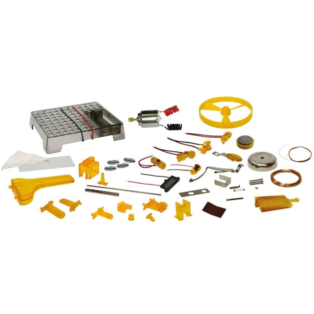 motor, vrtuli ventilátoru, držák motoru, základní desku, LED diodu, desku spínače, kovovou destičku, pružinové konektory, rezistor, plastovou destičku, kus látky, bzučák, dlouhou zelenou tyč, cívku, cívku motoru, kovový čep, nohu vahadlové houpačky, seřizovací šroub, pružinu seřizovacího šroubu, knoflík seřizovacího šroubu, oko seřizovacího šroubu, držák šroubu, matici, zvonek, stojan na zvonek, smaltový drát, aretační čep železné tyče, kladívko, zarážku kladívka, krátkou železnou tyč, kovový držák, brusný papír, špulku, světelný senzor, solární panel, diodu, magnet, návod.