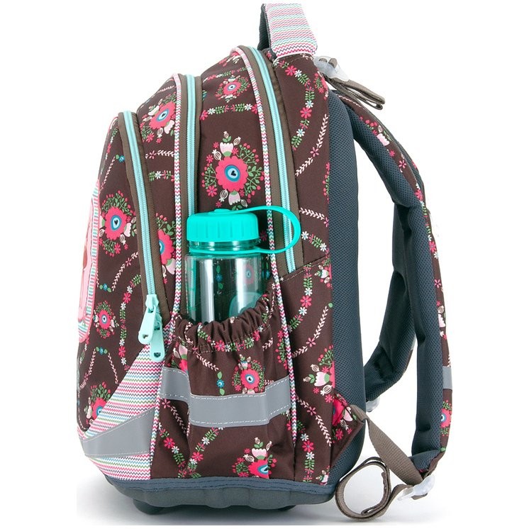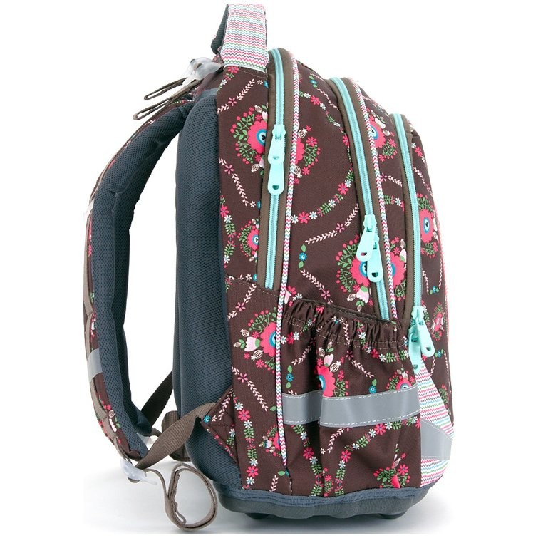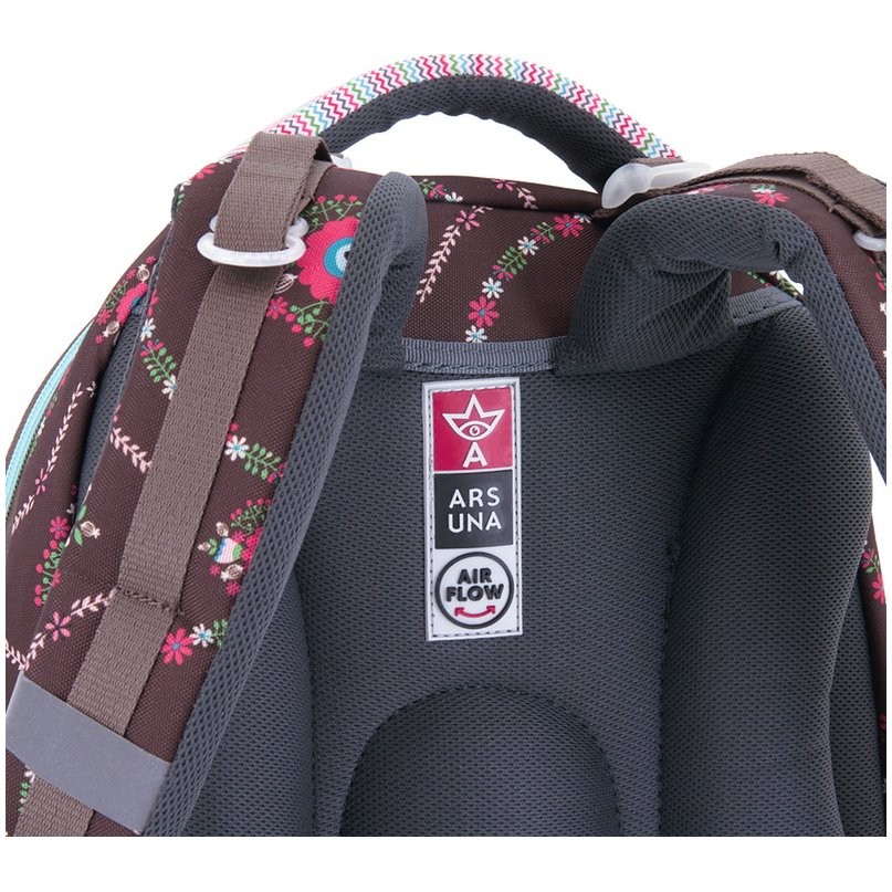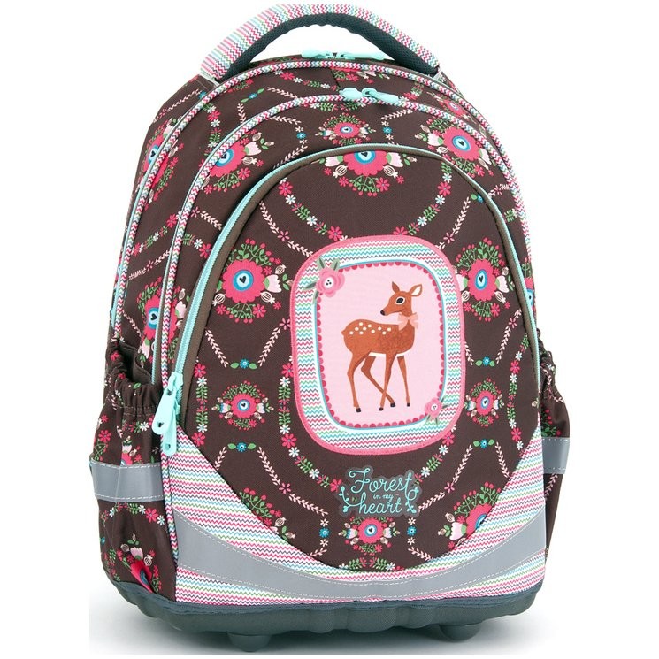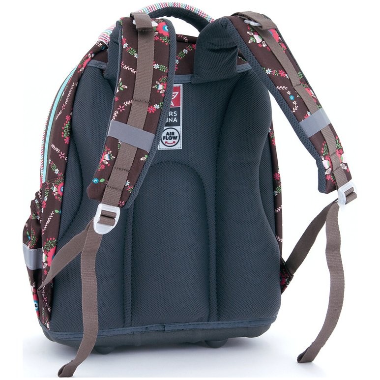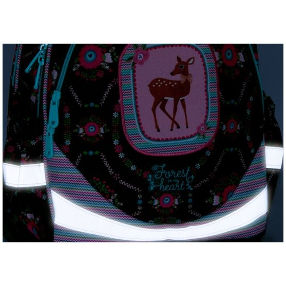 Školní batoh Ars Una z kolekce Forest in my heart. Tento batoh je tříkomorový se zapínáním na zip. Na výrobu byly použity velmi kvalitní materiály a rovněž zpracování je vynikající. Záda batohu jsou ergonomicky tvarované a mají skvělé prodyšné vlastnosti díky systému AirFlow. Ramenní popruhy jsou velmi pohodlné a nastavitelné do několika poloh. Bezpečnost zajišťuje několik reflexních prvků. Dno batohou je pevné a voděodolné. Batoh je určen pro děti od 9, 10 let věku, tedy žáky prvního stupně. Rozměr batohu je 320 x 410 x 210 mm. Váha pouhých 0,9 kg.