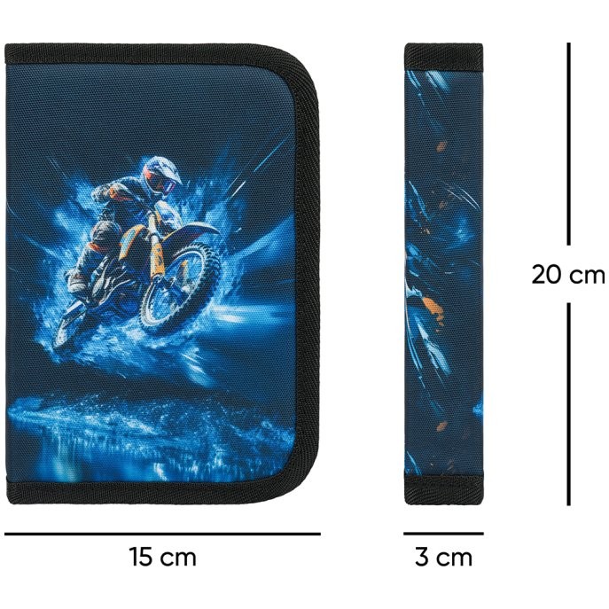Školní penál jednopatrový Motorka. V klasickém penálu se dvěma chlopněmi a obrázkem motorkáře bude mít váš školák všechny psací potřeby přehledně zorganizované.
