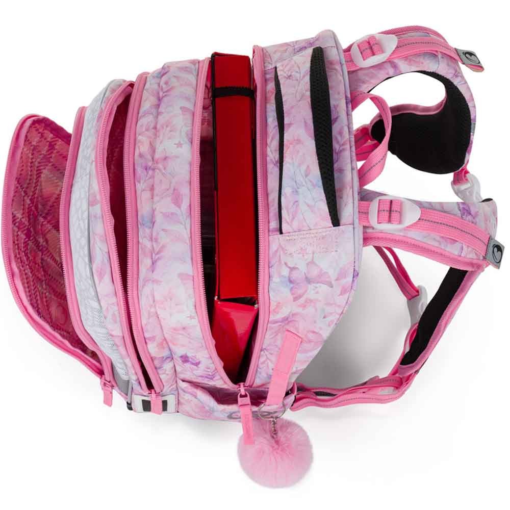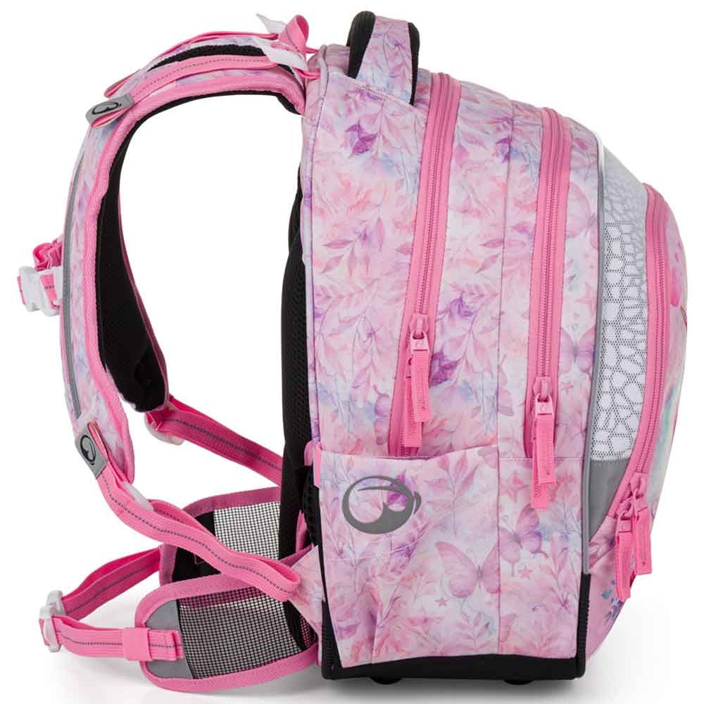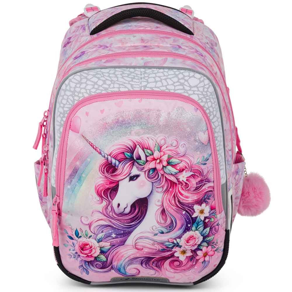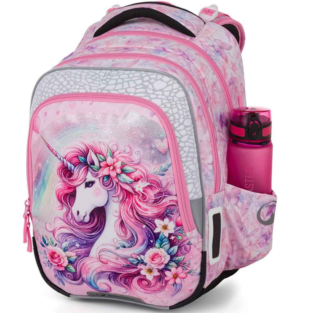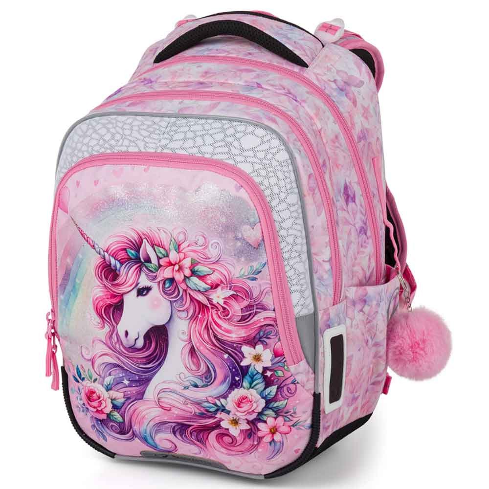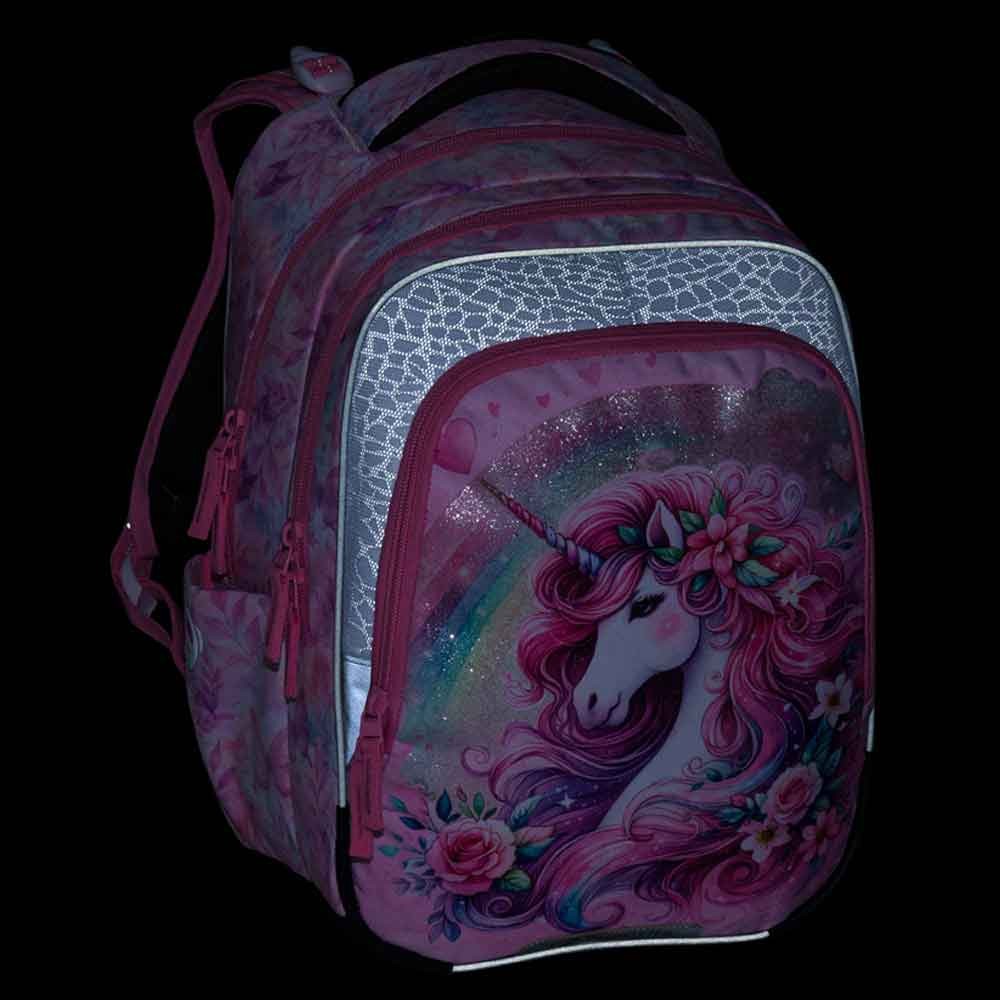 Školní batoh pro prvňáčky s jednorožcem pro malé slečny od 1. do 3. třídy základní školy. Váží jen 0,94 kg, přesto je velmi prostorný. Má tři hlavní komory a praktický organizér na mobil, peněženku a další drobnosti. Batoh stojí na plastových nožkách a ve tmě svítí reflexními prvky. Nový zádový systém s odlehčeným vyjímatelným bederním pásem a nastavitelným hrudním pásem má zdravotní posudek.