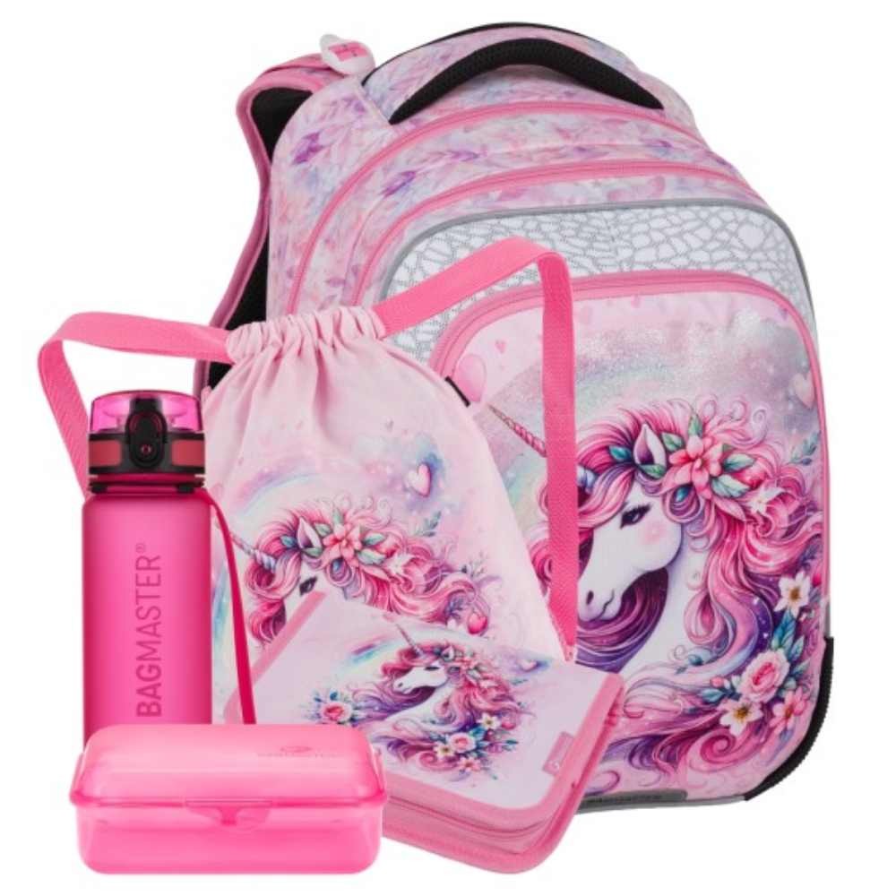 5dílný set tvoří batoh pro prvňáčky jednorožec, penál do školy a sáček na cvičky, láhev a box na svačinu. Do první třídy je vhodný pro dívky vyššího vzrůstu (cca od 128cm)