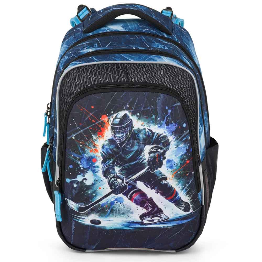 Školní taška pro prvňáčky od 1. do 3. třídy základní školy s hokejistou váží jen 0,94 kg, přesto je velmi prostorná. Má tři hlavní komory a praktický organizér na mobil, peněženku a další drobnosti. Batoh stojí na plastových nožkách a ve tmě svítí reflexními prvky. Nový zádový systém s odlehčeným vyjímatelným bederním pásem a nastavitelným hrudním pásem má zdravotní posudek.