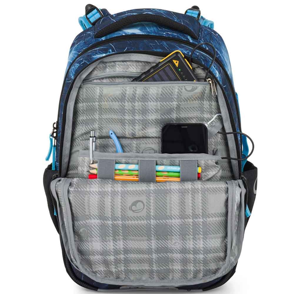 - Do hlavní komory se vejdou velké školní desky, učebnice i sešity formátu A4. Komora obsahuje kompresní kapsu s elastickými bočními pásy, která pomáhá udržet těžké pomůcky blízko zad a tím podporuje správné držení těla při chůzi.