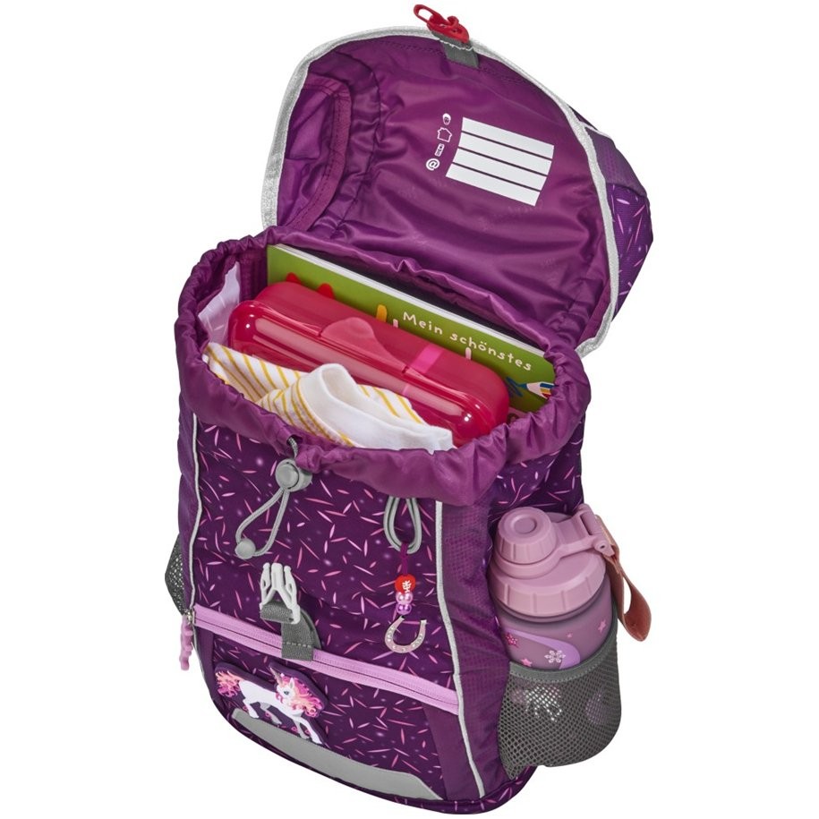 Prostorný dětský batoh pro dívky, hmotnost 380 g, optimální pro děti do školky, ale také jako volnočasový batoh pro děti od 1. do 4. třídy má vyměnitelné obrázky MAGIC MAGS, ergonomicky tvarovaná záda a ergonomicky tvarované ramenní popruhy. Reflexními prvky a výškově nastavitelný hrudní popruh jsou samozdřejmostí. Batoh má i poutko na nošení/ zavěšení a v klopě batohu je kapsa uzavíratelná na zip. Na batohu jsou dvě otevřené boční kapsy a přední kapsa na zip s reflexními prvky. Jednoduchá přezka na uzavření, prostorná hlavní kapsa se stahovadlem, kapsa A4 s elastickým páskem a kroužek pro zavěšení přívěsků, klíčů apod. V batohu je jmenovka. Batoh pro děti má omyvatelné dno batohu a vodoodpudivý materiál. Je tudiž ideální i na výlety.