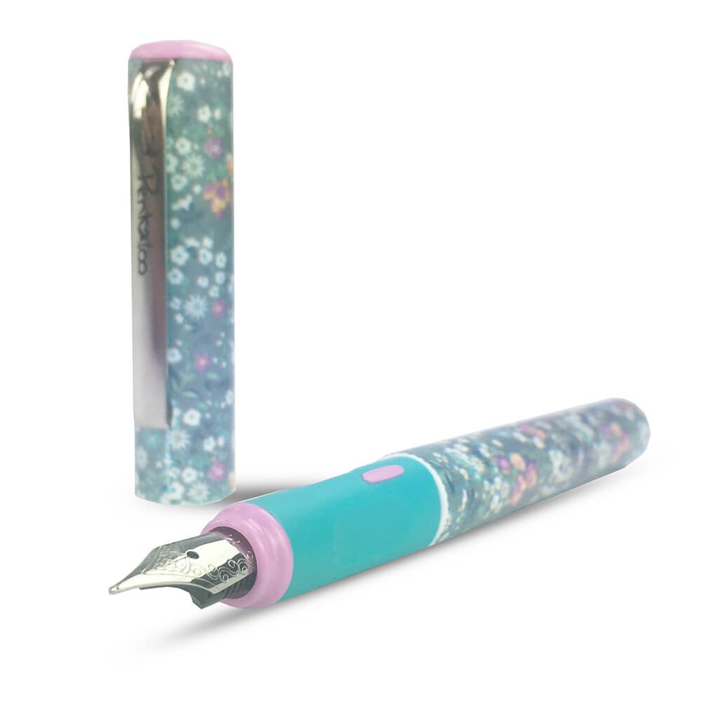 Plastové bombičkové pero s víčkem s květinovým motivem. Ergonomický úchop držení při psaní pro praváky i leváky. Délka pera: 13,5 cm.