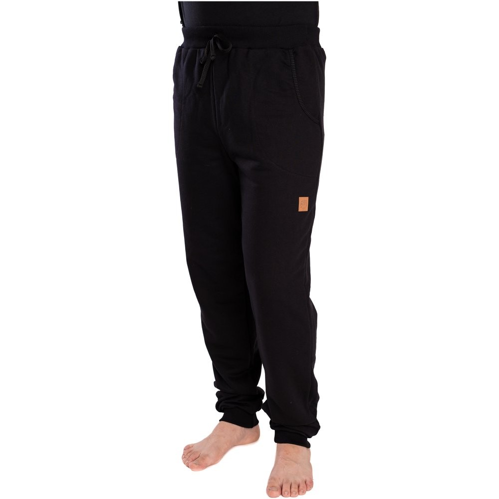 Pánské tepláky ukončené pružnou manžetou, ozdobené logem. Pánské tepláky na doma. Uštio na Moravě. Součástí tepláků jsou šňůrky, pomocí kterých se dá regulovat velikost pasu v případě potřeby. Pas je ukončen pružným lemem. Tepláky mají dvě přední kapsy. Model má pohodlný střih a je vhodný pro každodenní nošení.