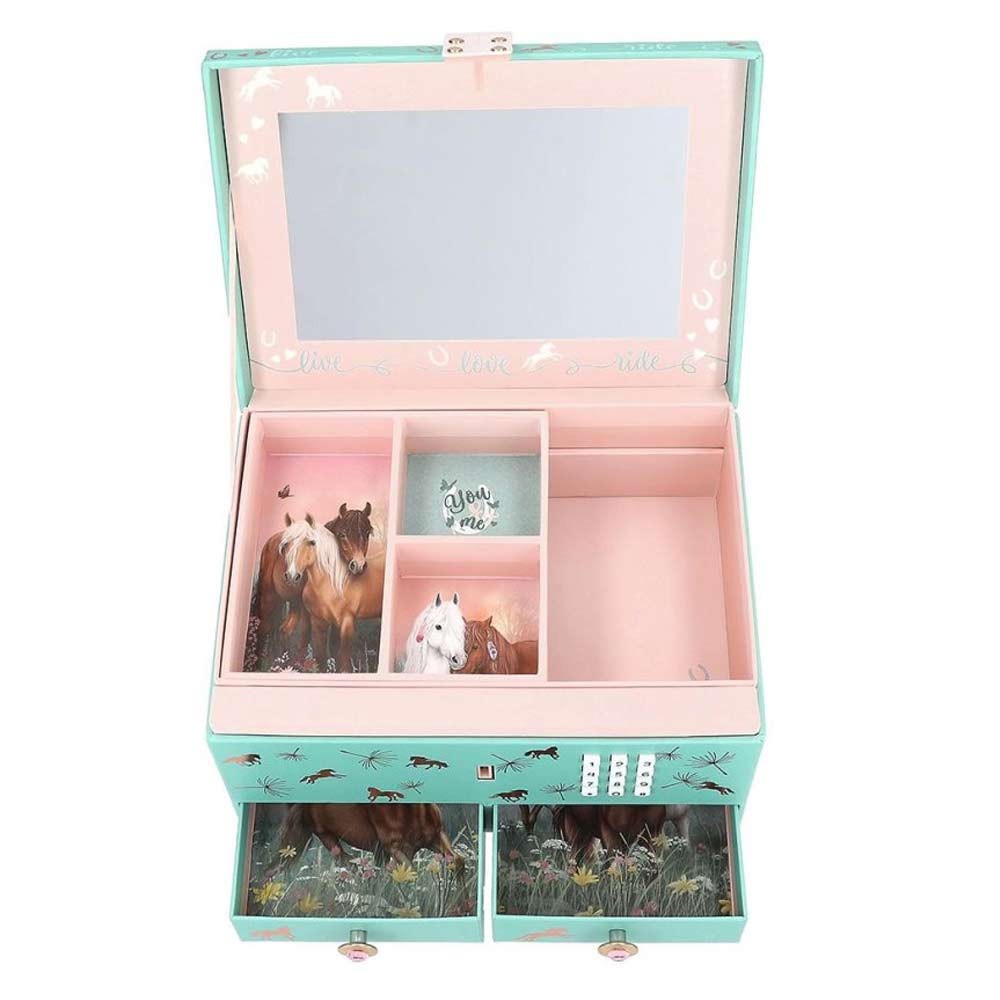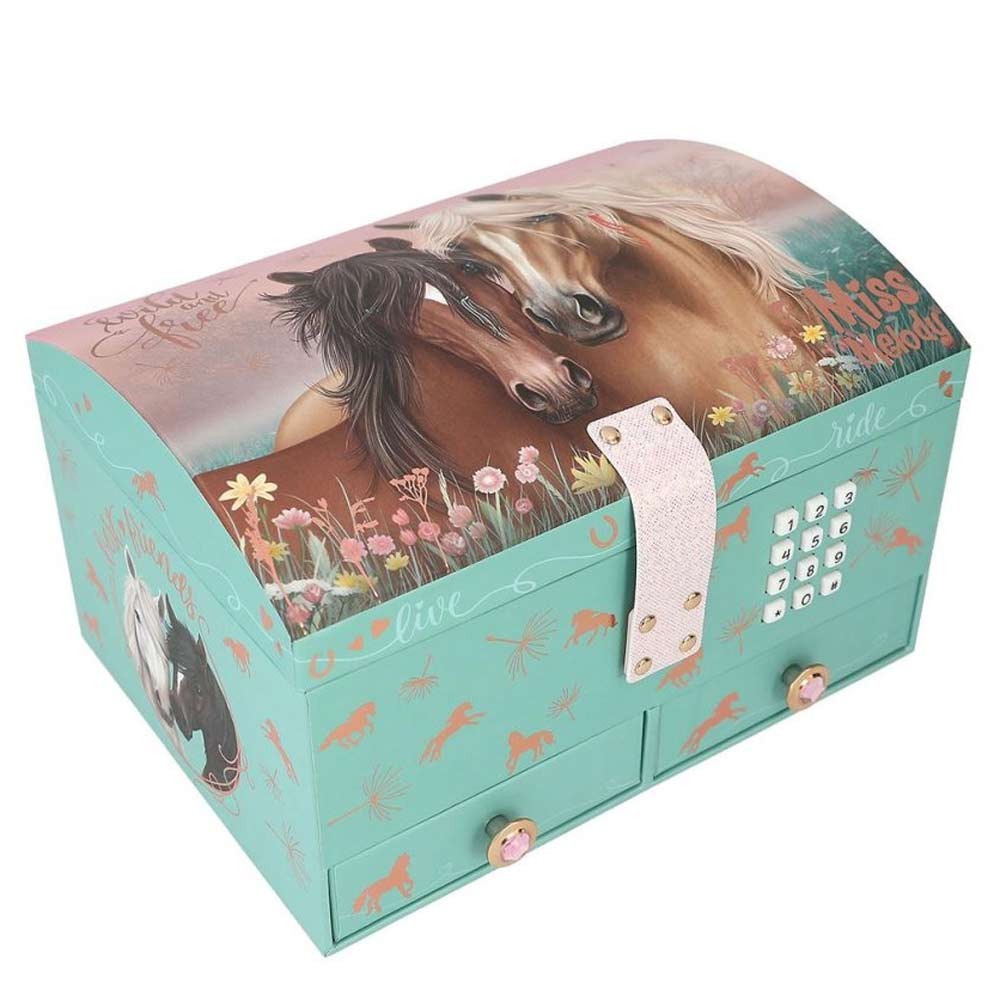 Stylová šperkovnice od Miss Melody s motivem roztomilých koníků na louce potěší každou milovnici šperků a módních doplňků. Šperkovnice pro holky je vybavena elektronickým zámkem na kód, díky kterému zůstanou všechny poklady v bezpečí. Při otevření se navíc ozve zvukový efekt, který dodá ještě více zábavy. Uvnitř najdete praktické přihrádky na prstýnky, náušnice i náramky a velké zrcátko na vnitřní straně víka. Spodní část obsahuje dvě zásuvky s originálními úchytkami. Šperkovnice je nejen praktická, ale i úžasný doplněk do pokojíčku!