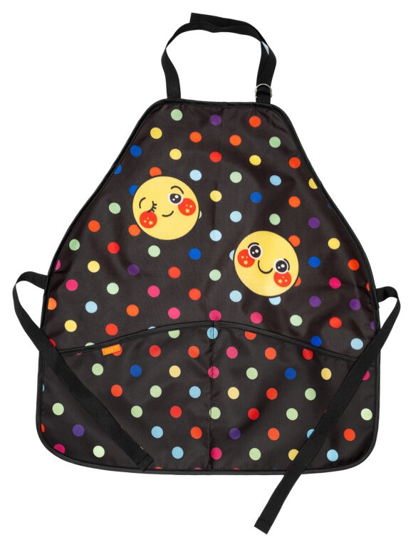 Zástěrka na výtvarnou výchovu Stil Smiley se navléká nastavitelným popruhem přes hlavu a zaváže se kolem těla pomocí šňůrek. Je vyrobena z omyvatelného polyesterového materiálu, který se lehce udržuje. Na přední straně jsou 2 kapsy na výtvarné pomůcky. Hlavní část zástěrky je potištěna obrázky ve školních designech, ladících ke školní kolekci.
