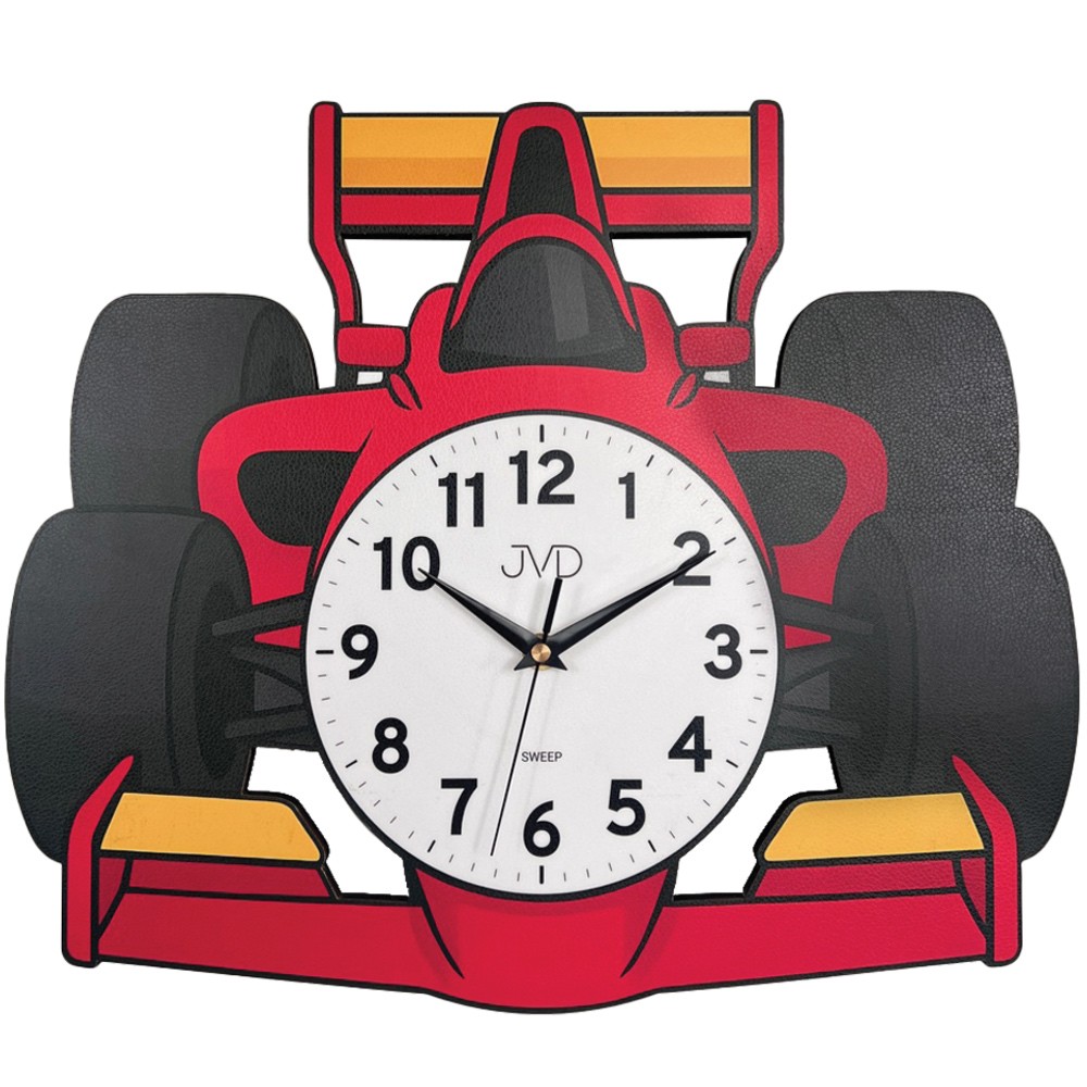 Dětské hodiny s motivem červeného závodního auta. Hodiny jsou vyrobeny ze dřeva a mají plynulý chod.