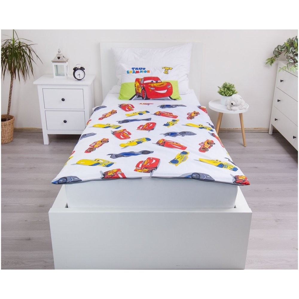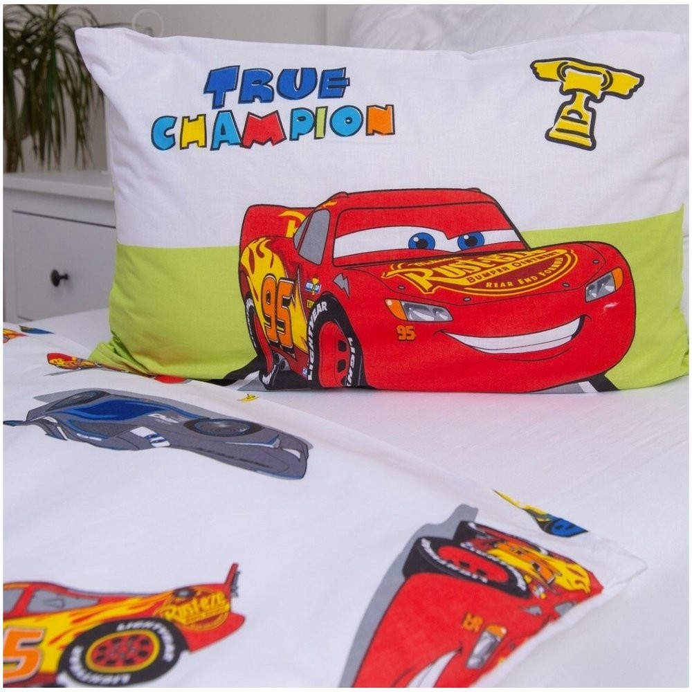 Povlečení do postýlky Cars Champion s Bleskem McQueenem, nápisem „TRUE CHAMPION“ a závodní scénou. Ideální pro malé fanoušky filmu Cars – pohodlí a rychlost v jednom! Rozměr povlečení je 40x60, 100x135 cm.