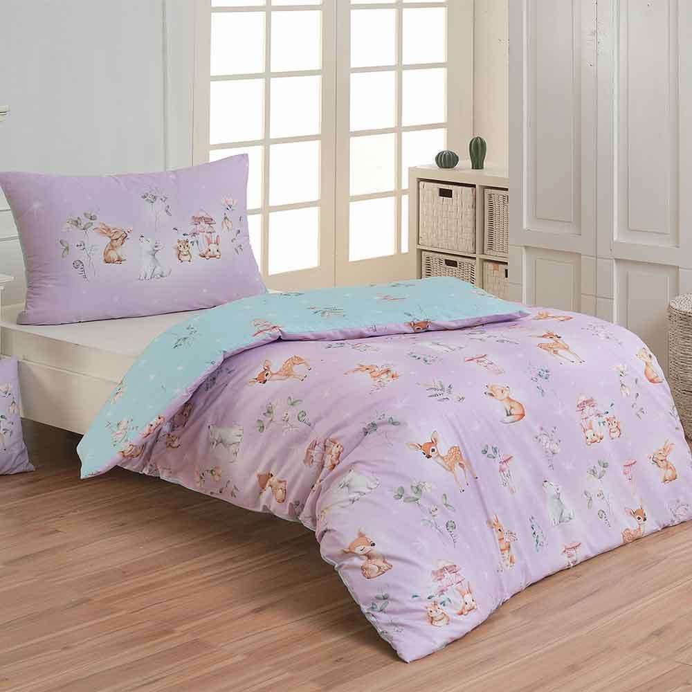 Dětské povlečení Matějovský Lesní pohádka v jemných pastelových tónech fialové a mentolové barvy okouzlí roztomilými motivy lesních zvířátek, která působí jako z pohádkové knížky. Srnečci, zajíčci a další obyvatelé lesa vytvářejí hravou a harmonickou atmosféru, kterou si děti okamžitě zamilují.