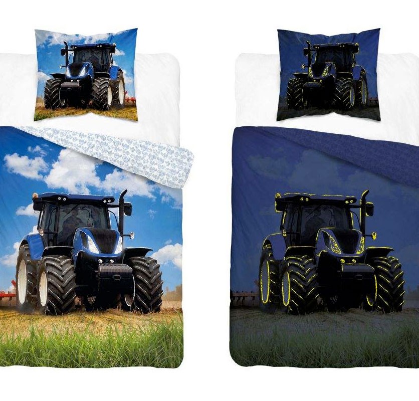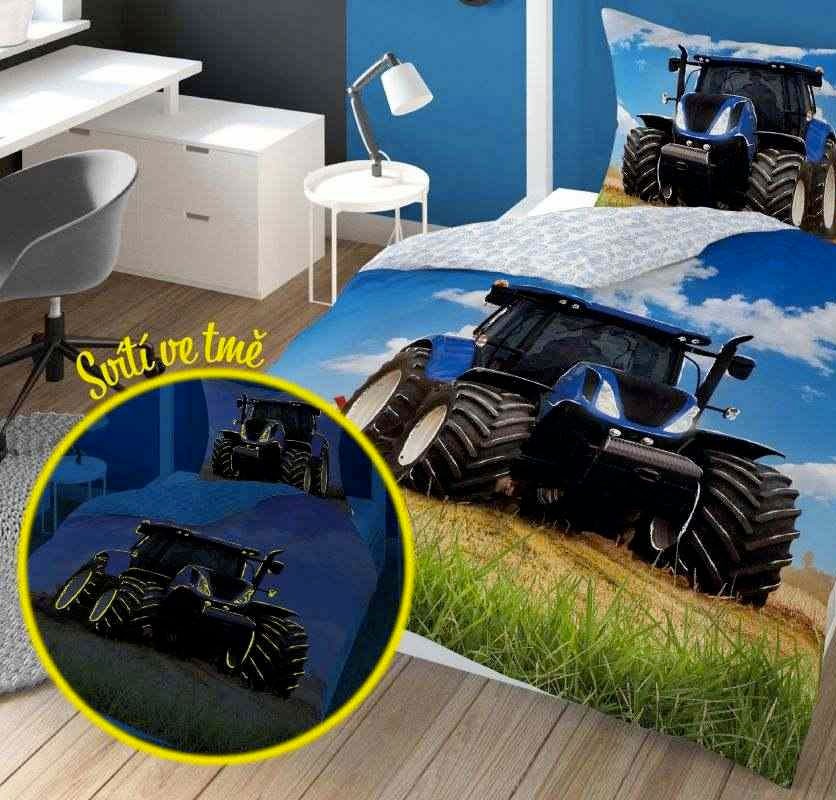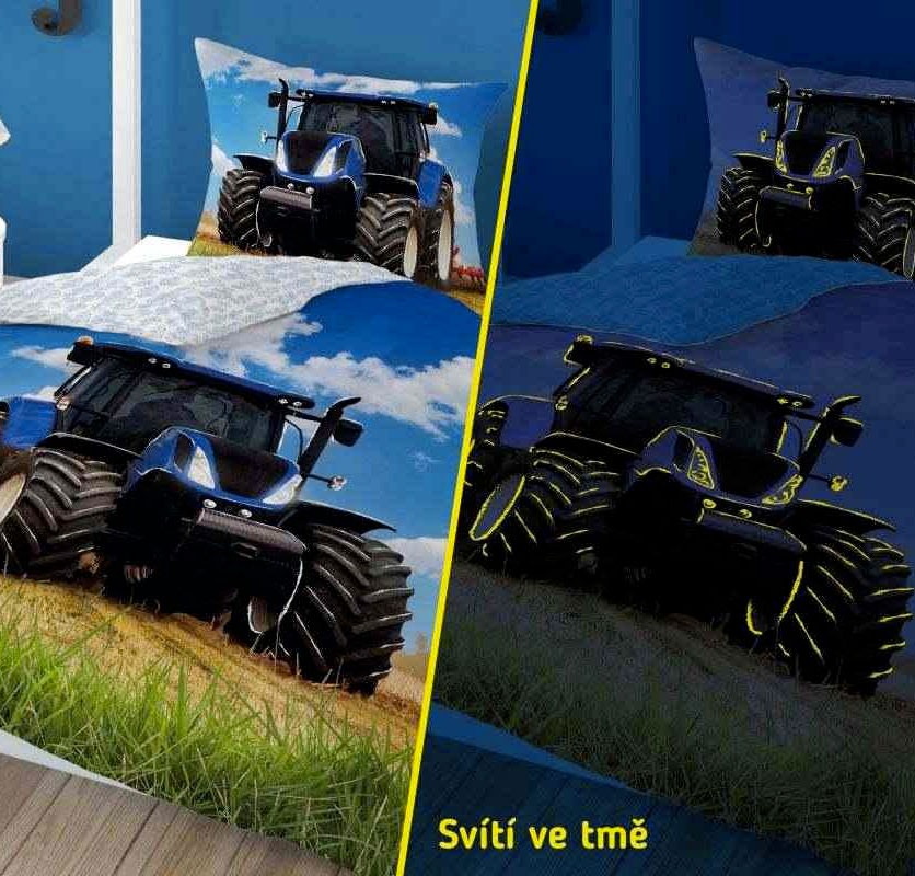 Oboustranné bavlněné dětské povlečení traktor. Povlečení na velkou postel, obsahuje jeden povlak na přikrývku a povlak na polštář, zapínání je na zip. Dětské povlečení na postel svítící po nasvícení na denním světle, svítící efekt se může začít vytrácet po 5 vypráních.