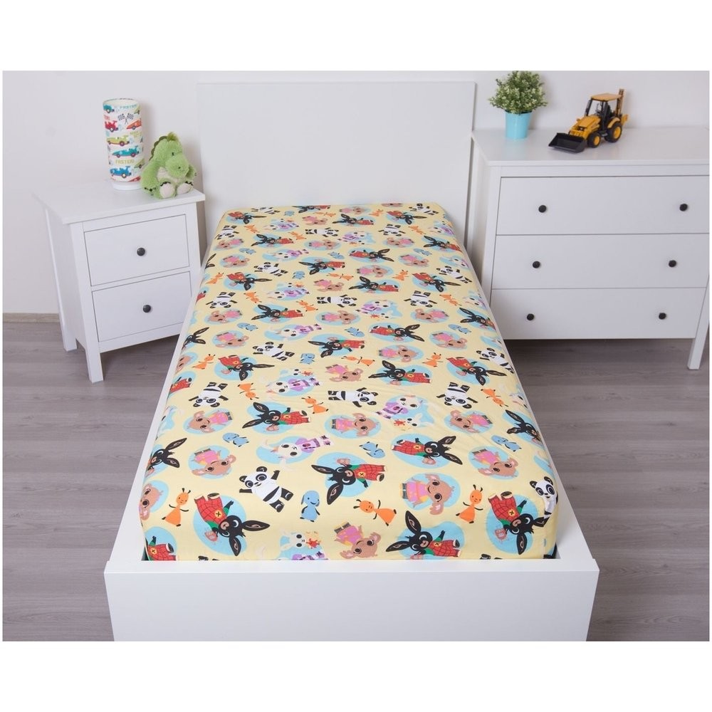 Prostěradlo má světle žlutý podklad a je pokryto opakujícím se vzorem, který zahrnuje různé postavičky z animovaného seriálu Králíček Bing.