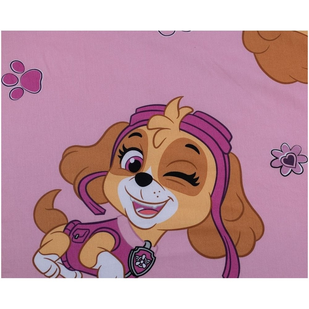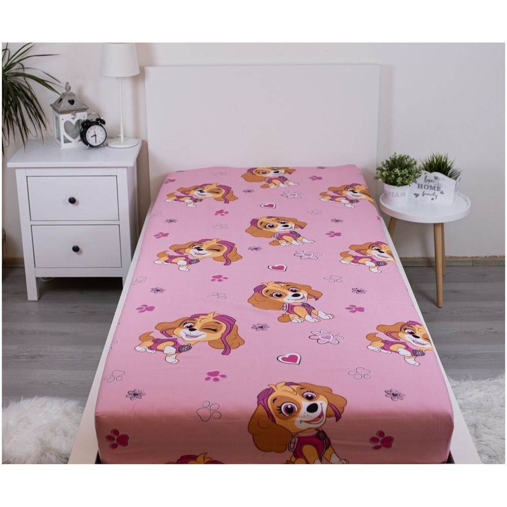 Roztomilé dětské prostěradlo 90x200 s motivem oblíbené psí hrdinky Skye z animovaného seriálu Tlapková patrola. Růžový podklad zdobí opakující se obrázky Skye v různých pozicích, doplněné o květinky, srdíčka a tlapky. Ideální pro malé fanynky této odvážné pilotky.