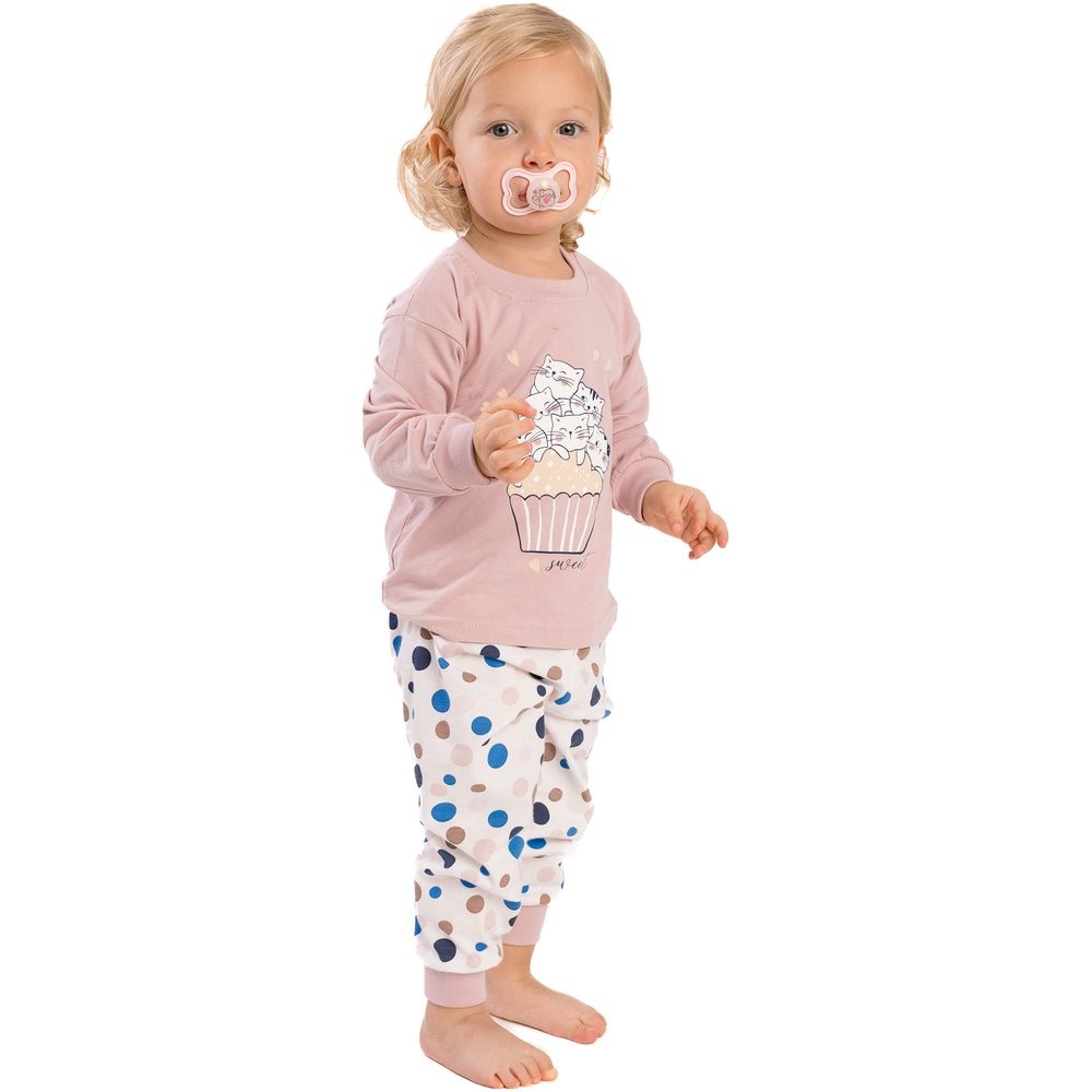 Pyžamo má veselý vzor kočičí rodinky a krásnou růžovou barvu, ideální jako růžové pyžamo do dětského šatníku.