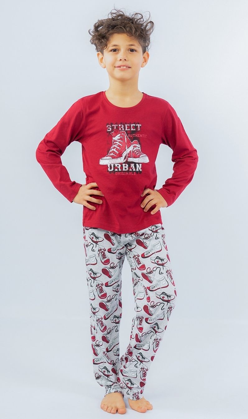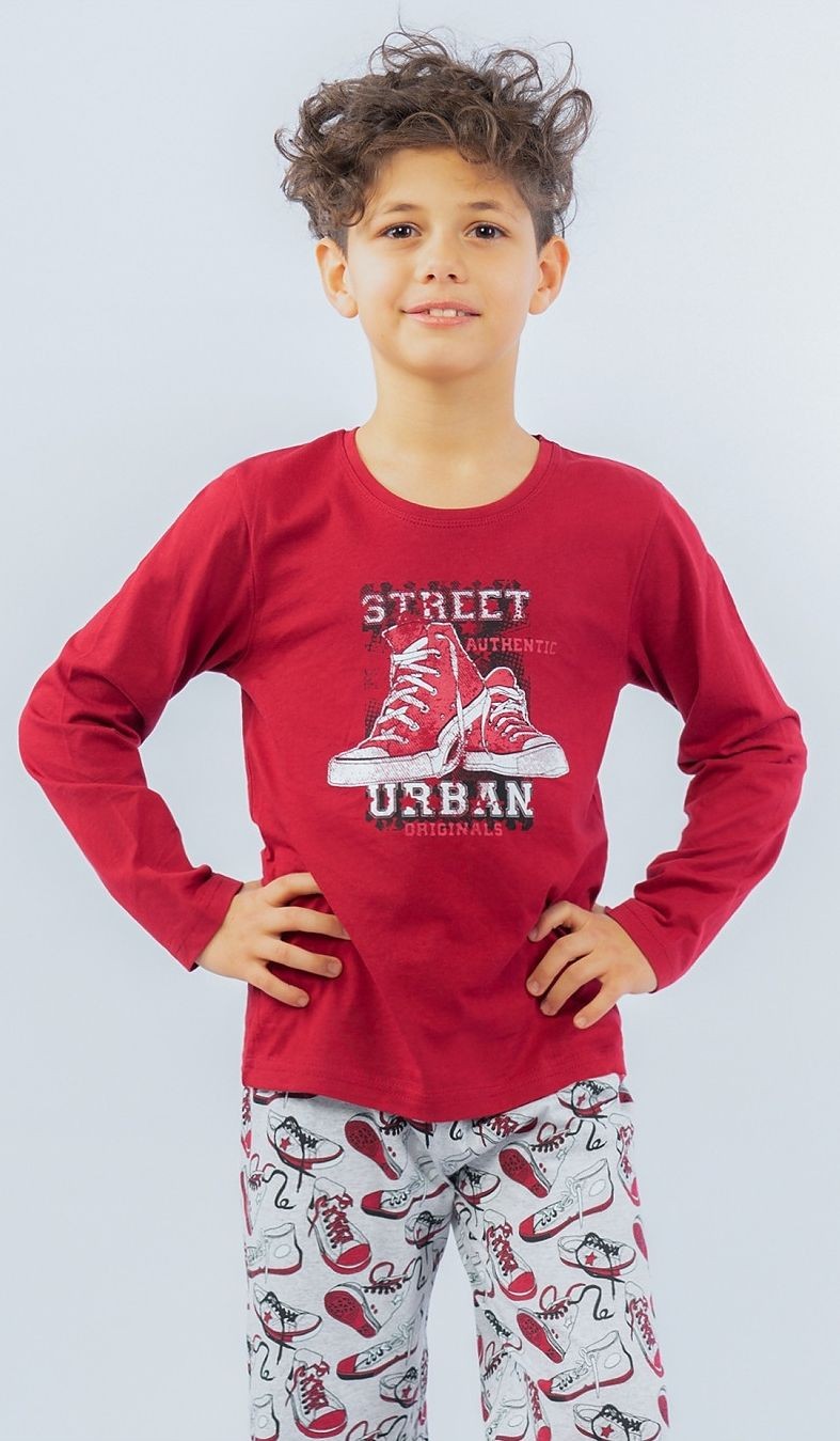 Dětské pyžamo dlouhé Tenisky se skládá z trička s dlouhým rukávem a dlouhých kalhot. Na tričku je obrázek městských tenisek s nápisem Street authentic Urban Originals. Motiv tenisek se opakuje i na dlouhých kalhotách. Použitý materiál je jemný a poddajný na dotek. Pyžamo je vhodné i na denní nošení.