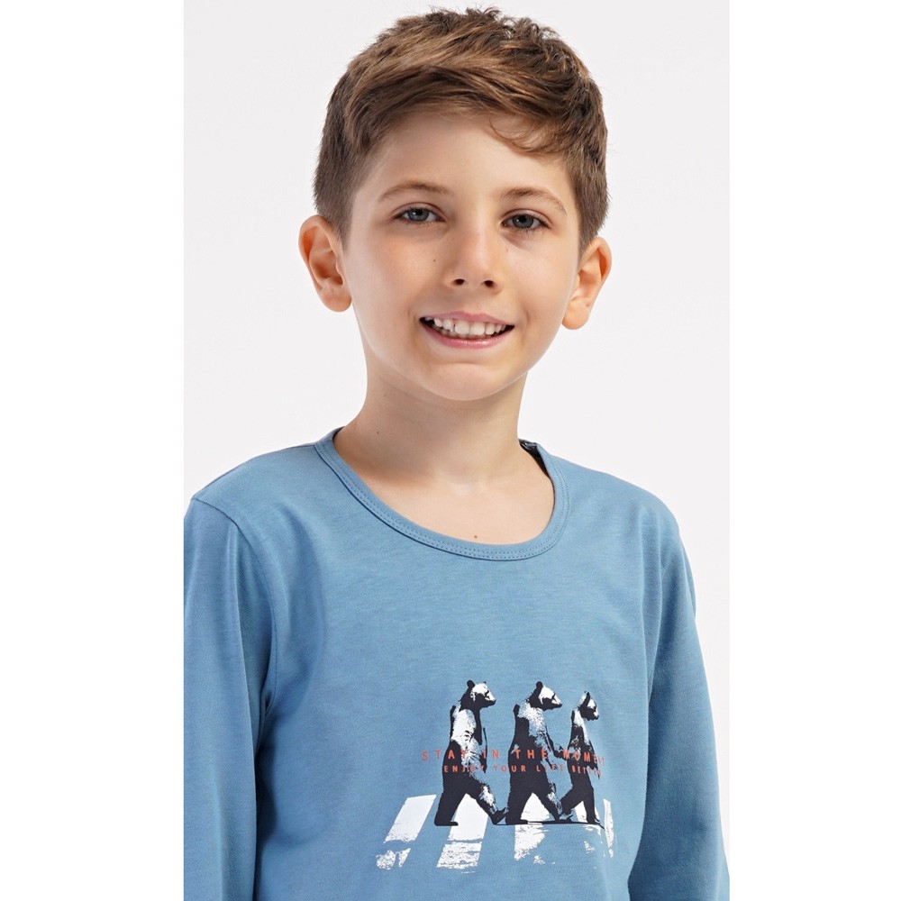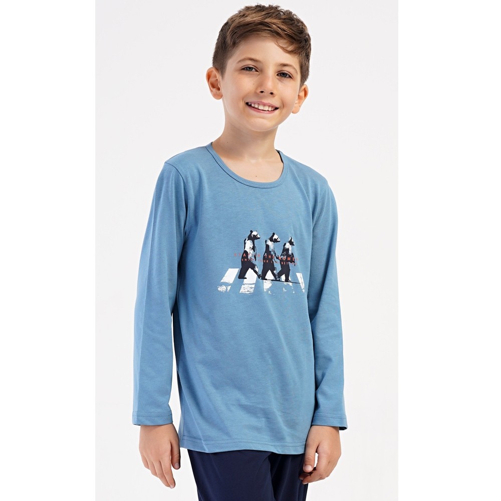 Chlapecké pyžamo Tobias modré. Pyžamo se skládá z trika s dlouhým rukávem a dlouhých kalhot. Triko s kulatým výstřihem zdobí obrázek tří medvědů na přechodu. Jednobarevné dlouhé kalhoty mají v pase gumu a šňůrku na stažení, jsou bez kapes.