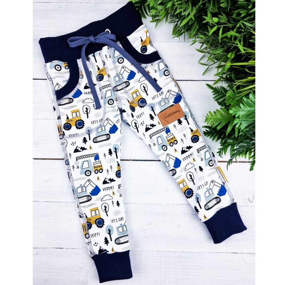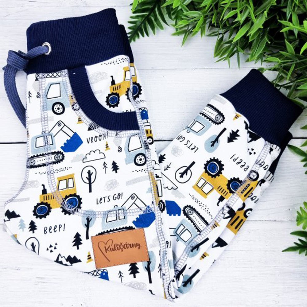 Chlapecké tepláky s krásným motivem stavitel a originálním prošitím. Mají klasický střih, ve spodní části mají náplet, který zajistí příjemné nošení. Díky nápletu se nohavice nebudou při aktivitách vyhrnovat, tepláky mají v pase gumu a funkční šnůrky.