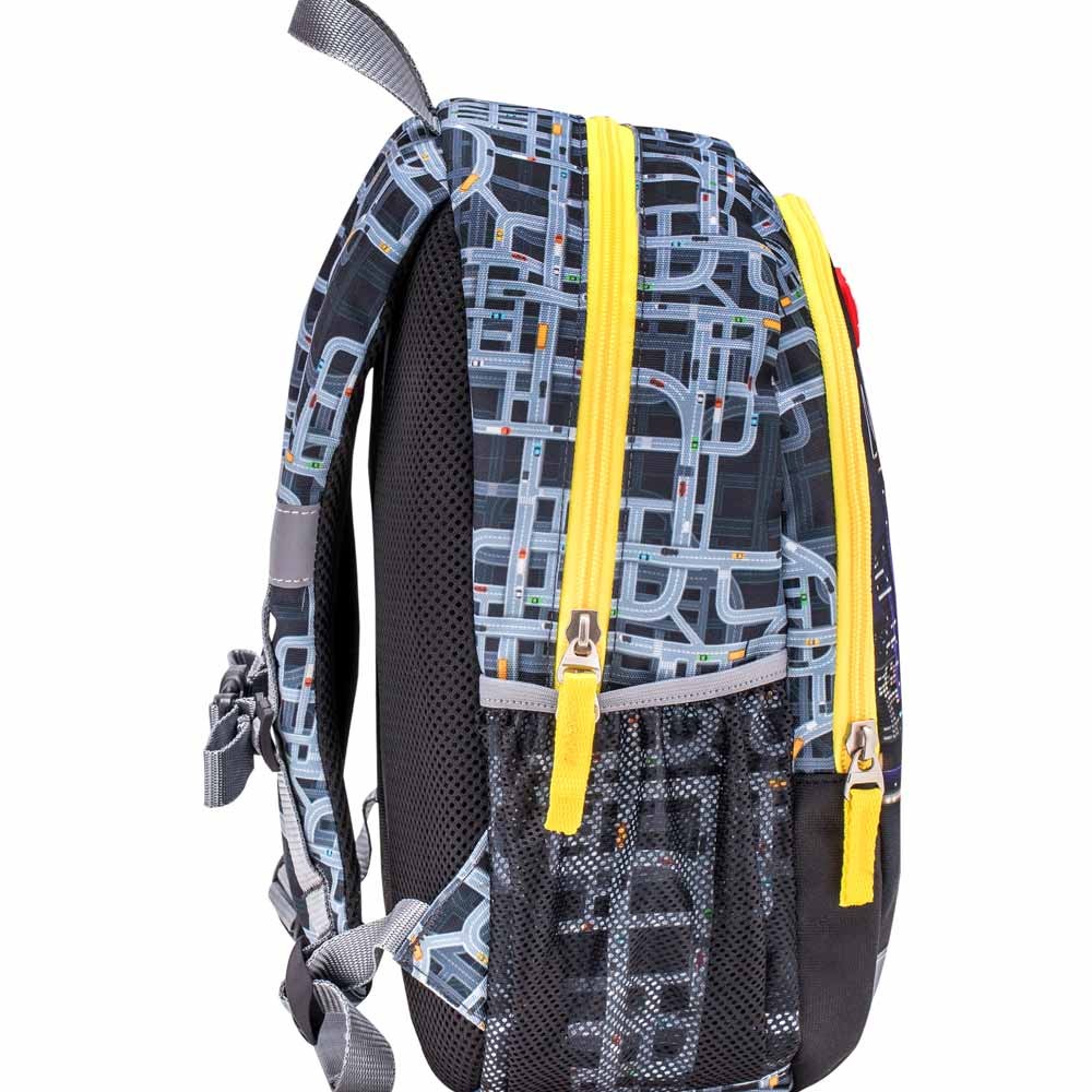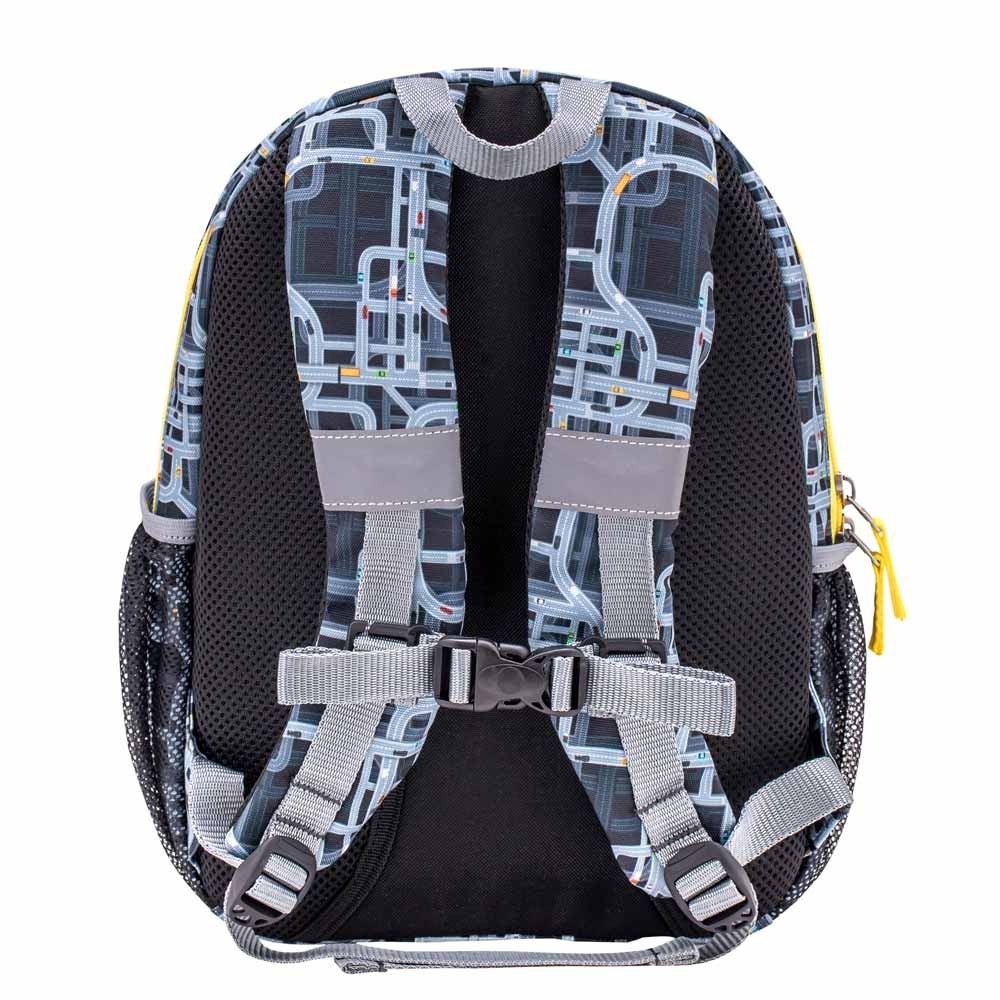 Záda batůžku jsou polstrované měkkou síťovanou pěnou, ramenní popruhy jsou širší, také polstrované a snadno nastavitelné. Hrudní popruh poslouží k optimálnímu rozložení zátěže a zabraňuje sklouznutí batohu z dětských ramen. Batoh má 2 komory - větší komora má na podšívce tištěnou jmenovku. Boční síťované kapsy pojmou láhev na pití (až 0,7 l) nebo deštník.