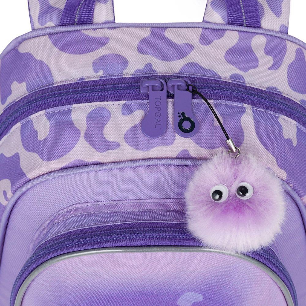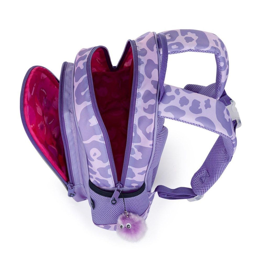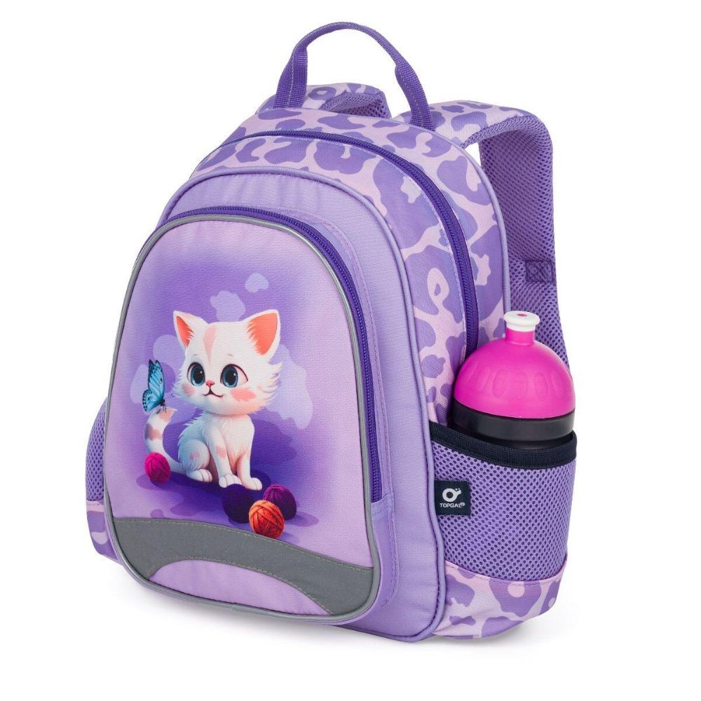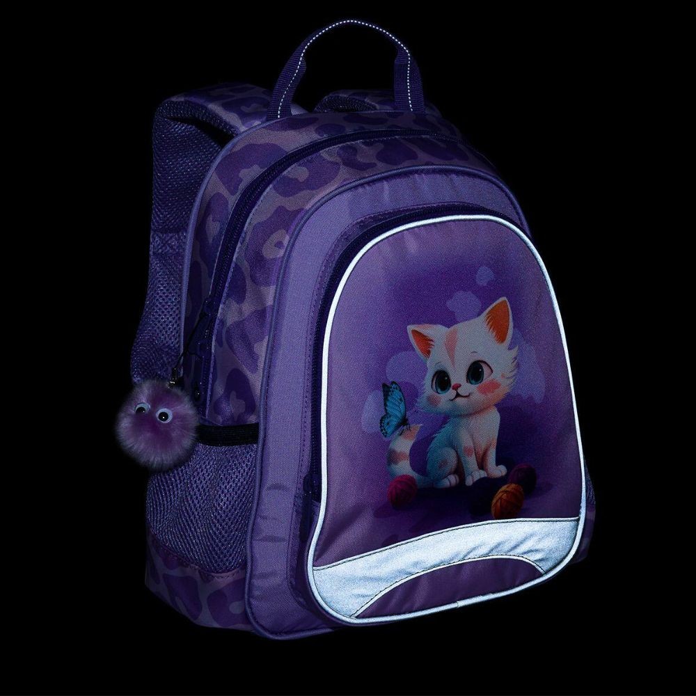 Fialový batoh pro holčičky v předškolním věku. Roztomilou kočičku zdobí chlupatý přívěsek. Batůžek pro děti od dvou let se hodí na výlety, do kroužků, do školky i k babičce. Dobře ale poslouží i malým školačkám i školákům na školní výlety. Tady pozor - A4 se do něj nevejde. Batoh má jednu hlavní komoru se jmenovkou, prostornou přední kapsu na zip a dvě malé postranní elastické kapsičky vhodné např. na lahev s pitím. Samozřejmostí jsou reflexní prvky, pohodlné polstrované ramenní popruhy a polstrovaná záda. Batůžek má také praktické poutko k nošení v ruce.
