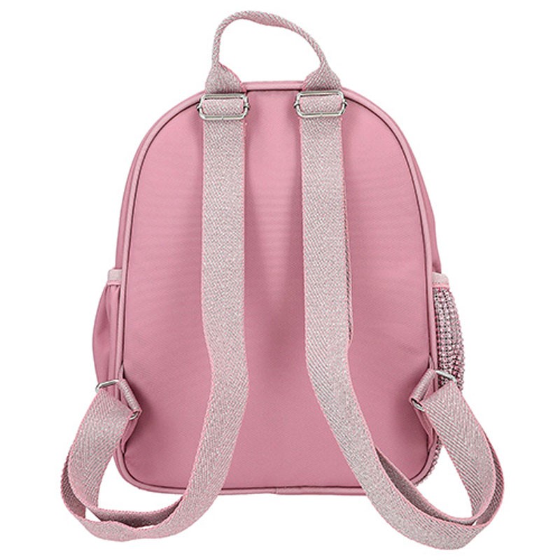 Tento batoh je ideální na školní výlet, nebo na tělesnou výchovu. Disponuje velkou kapsou, v které se nachází malá přihrádka. Nechybí ani boční kapsy s gumou na láhev. Batoh má nastavitelné ramenní popruhy. Batůžek je krásně dozdobený kamínky a třpytkami.