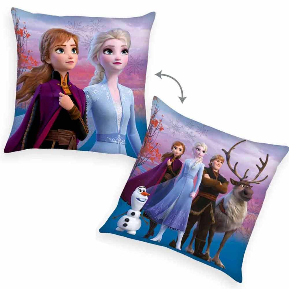Oboustranný dětský polštářek s motivem hlavní hrdinky Elsy a její sestry Anny z oblíbené pohádky Ledové Království. Na druhé straně polštářku jsou s nimi i Kristoff, sněhulák Olaf a sob Sven.
