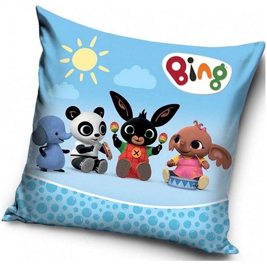 Licenční polštářek Bing a jeho přátel laděný do světle modré barvy. Polštářek se skládá z povlaku se zipem a plněného polštářku z netkané textilie.