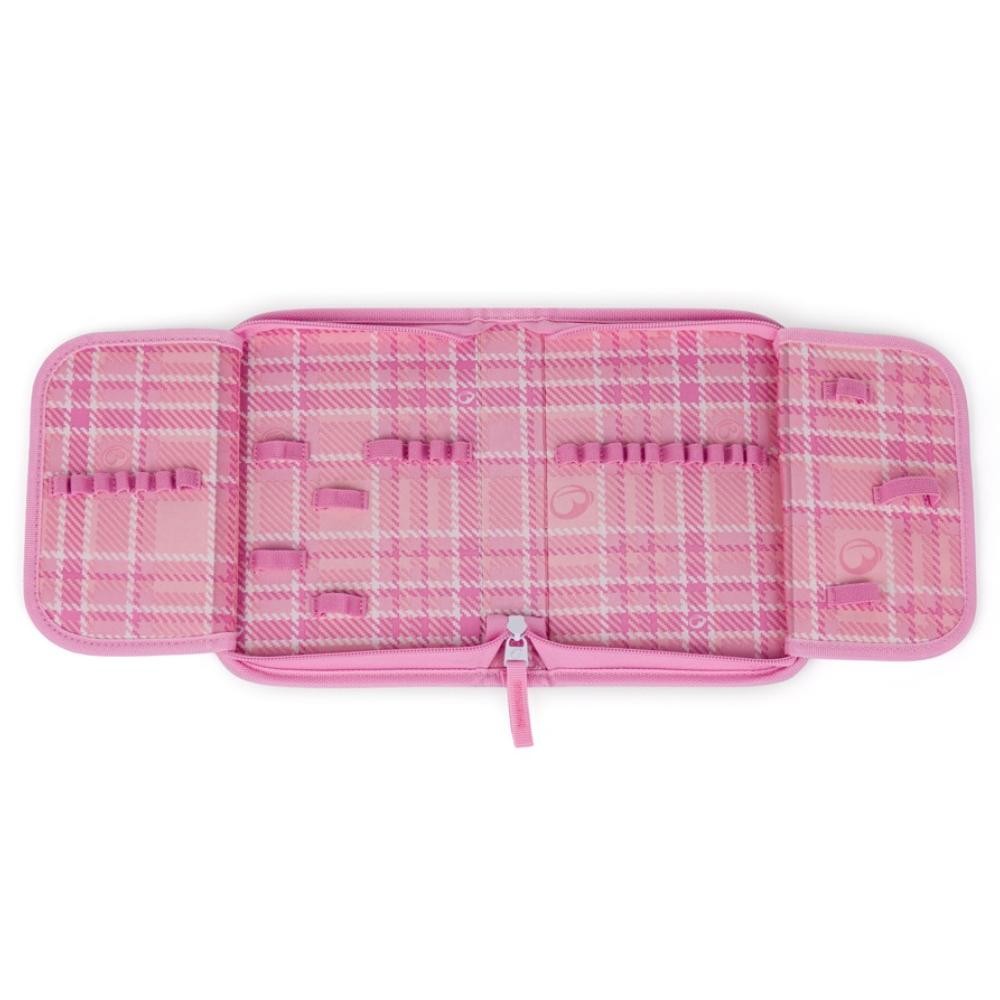 Školní penál pro dívky LUMI 26 A zpříjemní každý školní den. Uvnitř hezkého obalu jsou dvě klopy s kapsami a s gumovými úchyty na psací potřeby. Na dvou otevíravých chlopních je 35 pružných gumových úchytů na pastelky, pera, fixy, gumu, kružítko a další pomůcky. Pružná očka jsou poctivě přišitá a vyrobená z kvalitní gumy – nevytrhávají se ani nedeformují. Na horní straně chlopně je průhledná kapsy na rozvrh a na výukové kartičky. Na druhé chlopni je kapsa se zipem. Pouzdro se zavírá kvalitním zipem s praktickým kovovým taháčkem a látkovým poutkem.