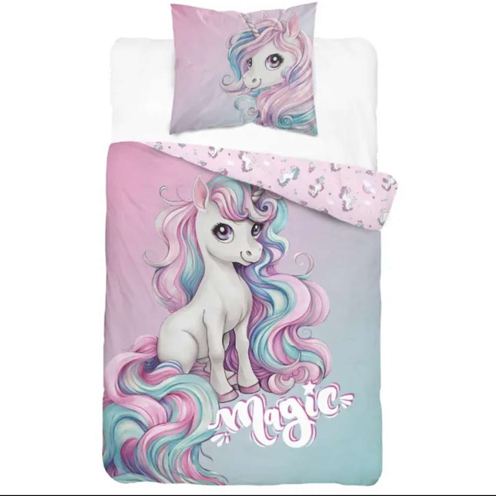 Roztomilé bavlněné dětské povlečení s motivem jednorožce přinese do dětského pokoje jemnou pastelovou magii. Veselý design s velkýma zářivýma očima a duhovou hřívou okouzlí každého malého snílka. Hebká 100% bavlna je příjemná na dotek, prodyšná a šetrná k citlivé pokožce, takže zajistí klidný a pohodlný spánek. Praktické zapínání na zip usnadní převlékání a pevné švy zaručí dlouhou životnost.