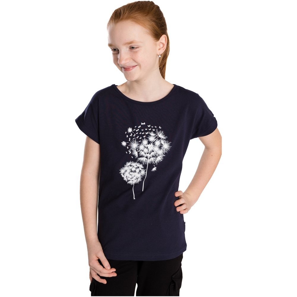 Dívčí tričko s elastanem a jemným obrázkem pampelišky. Okolo krku je lemováno tenkým pružným lemem, hezky drží tvar a snadno se obléká.