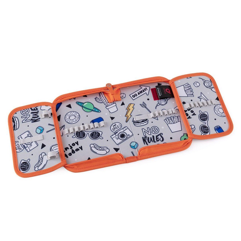 Jednopatrové školní pouzdro se dvěma klopnami je vybaveno 21 klasickými gumovými úchyty na pastelky a fixy, třemi širšími úchyty na pravítko, kružítko či nůžky a dvěma většími úchyty na gumu a ořezávátko. Pod klopou z průhledné folie najdete rozvrh hodin, druhé poslouží třeba i na taháky.