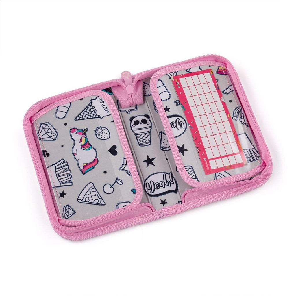Jednopatrové školní pouzdro se dvěma klopnami je vybaveno 21 klasickými gumovými úchyty na pastelky a fixy, třemi širšími úchyty na pravítko, kružítko či nůžky a dvěma většími úchyty na gumu a ořezávátko. Pod klopou z průhledné folie najdete rozvrh hodin, druhé poslouží třeba i na taháky.