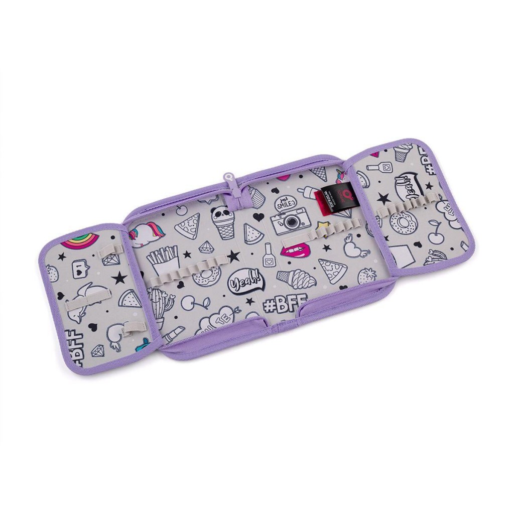 Jednopatrové školní pouzdro se dvěma klopnami je vybaveno 21 klasickými gumovými úchyty na pastelky a fixy, třemi širšími úchyty na pravítko, kružítko či nůžky a dvěma většími úchyty na gumu a ořezávátko. Pod klopou z průhledné folie najdete rozvrh hodin, druhé poslouží třeba i na taháky.