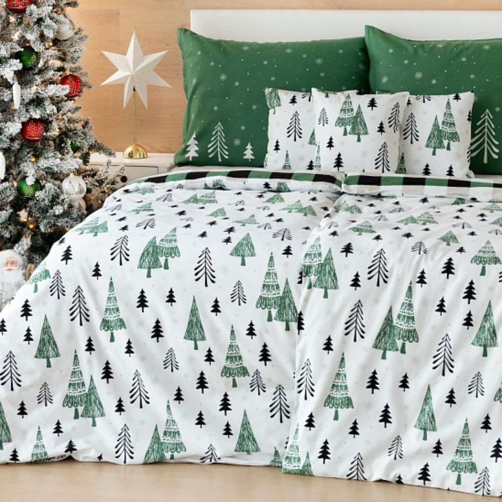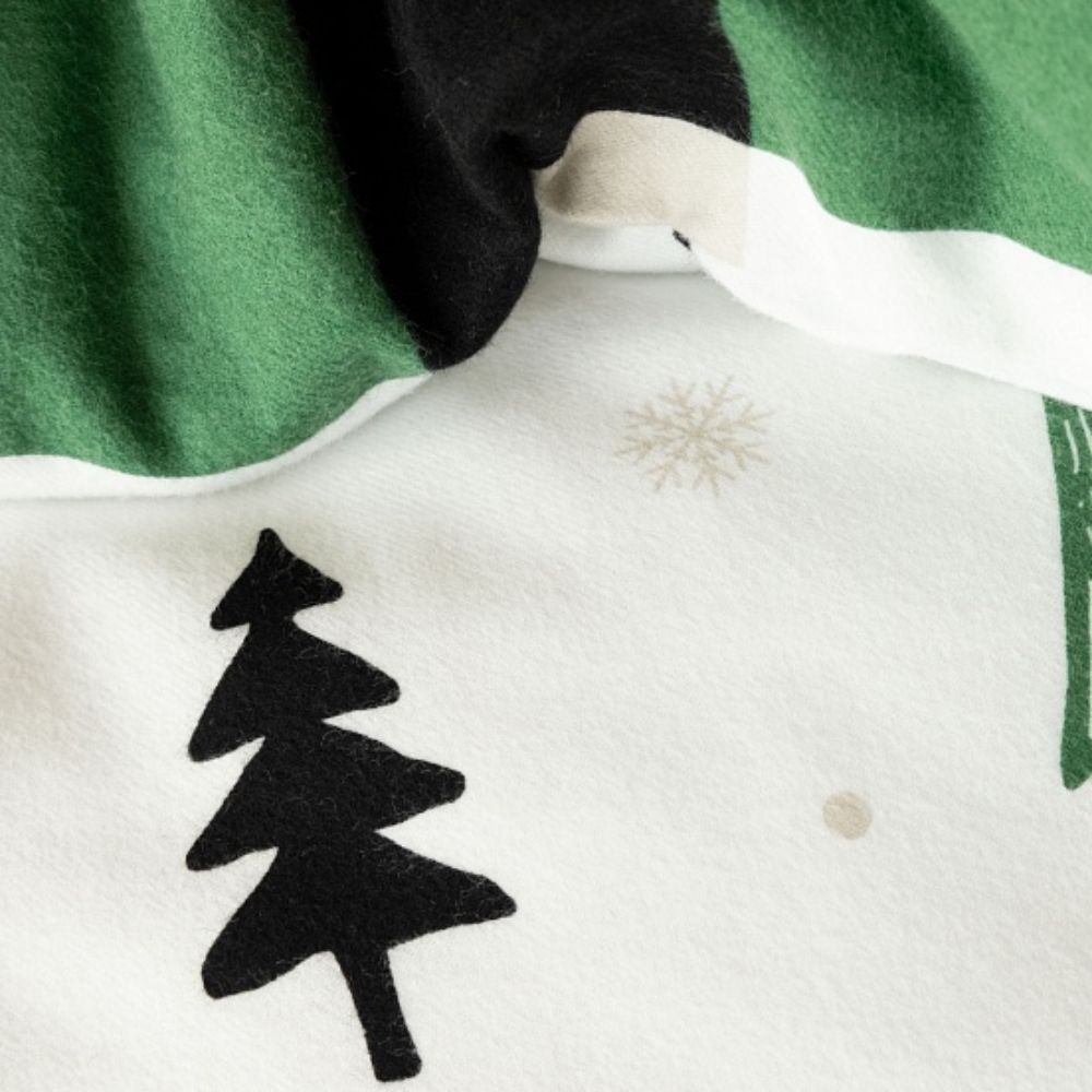 Povlak na přikrývku je z jedné strany posetý kresbou menších a větších stromků, sněhových vloček a drobných puntíků. Spodní strana cíchy je tvořena bílou, černou a zelenou kostkou. Povlak na polštář je z každé strany jiný, jak je vyobrazeno na fotografii. Povlečení je opatřeno komfortním zipovým uzávěrem.